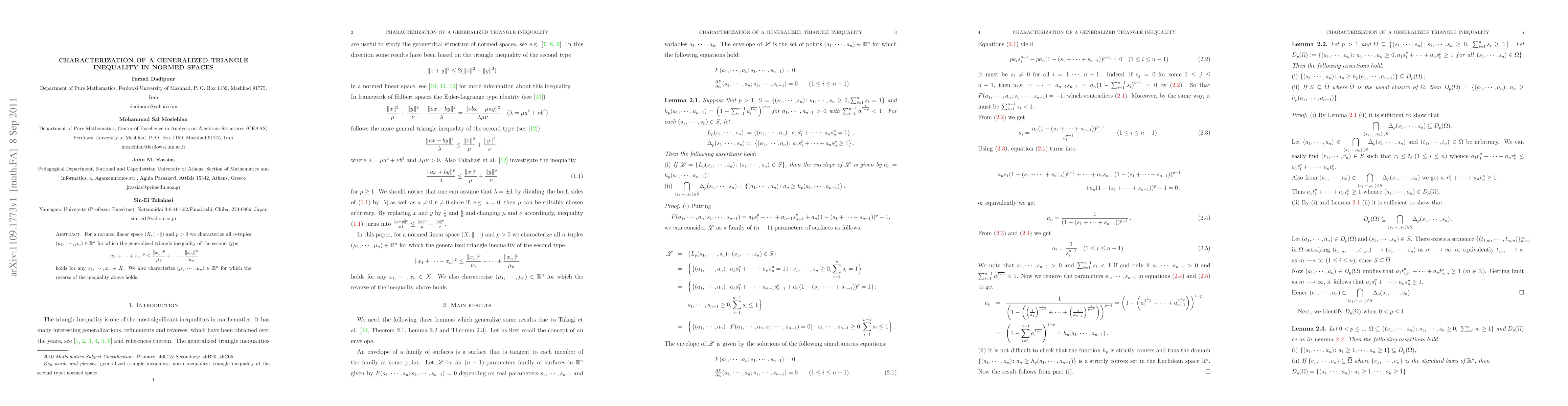 For a normed linear space $(X,|\cdot|)$ and $p>0$ we characterize all $n$-tuples $(\mu_1,...,\mu_n)\in\mathbb{R}^{n}$ for which the generalized triangle inequality of the second type $$\|x_1+...+x_n\|^p\leq\frac{|x_1|^p}{\mu_1}+...+\frac{|x_n|^p}{\mu_n}$$ holds for any $x_1,...,x_n\in X$. We also characterize $(\mu_1,...,\mu_n)\in\mathbb{R}^{n}$ for which the reverse of the inequality above holds.