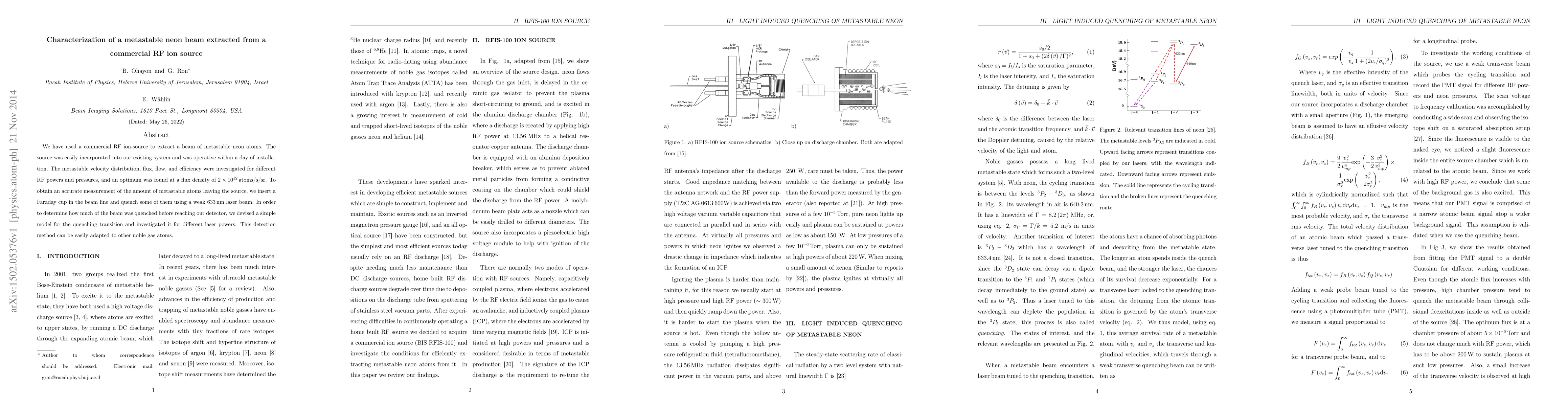 The paper details the use of a commercial RF ion source to extract a beam of metastable neon atoms, finding an optimal flux density. The methodology involved adjusting RF powers and pressures, and using a Faraday cup with a quenching laser to accurately measure the metastable atom output, a technique adaptable to other noble gases.