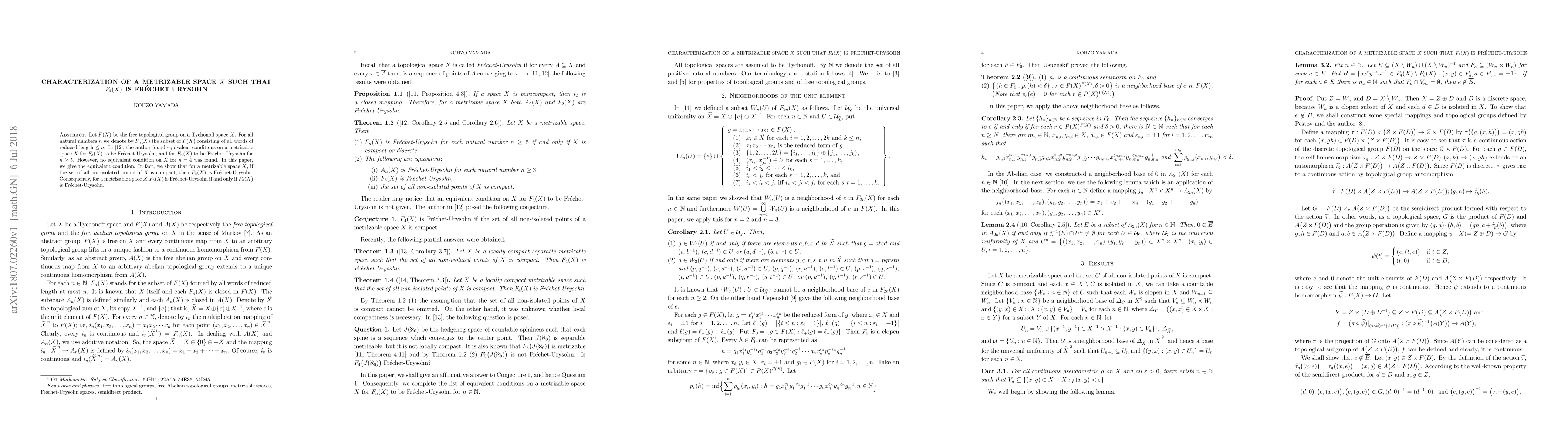Let $F(X)$ be the free topological group on a Tychonoff space $X$. For all natural numbers $n$ we denote by $F_n(X)$ the subset of $F(X)$ consisting of all words of reduced length $\leq n$. In \cite{Y3}, the author found equivalent conditions on a metrizable space $X$ for $F_3(X)$ to be Fr\'echet-Urysohn, and for $F_n(X)$ to be Fr\'echet-Urysohn for $n\geq5$. However, no equivalent condition on $X$ for $n=4$ was found. In this paper, we give the equivalent condition. In fact, we show that for a metrizable space $X$, if the set of all non-isolated points of $X$ is compact, then $F_4(X)$ is Fr\'echet-Urysohn. Consequently, for a metrizable space $X$ $F_3(X)$ is Fr\'echet-Urysohn if and only if $F_4(X)$ is Fr\'echet-Urysohn.