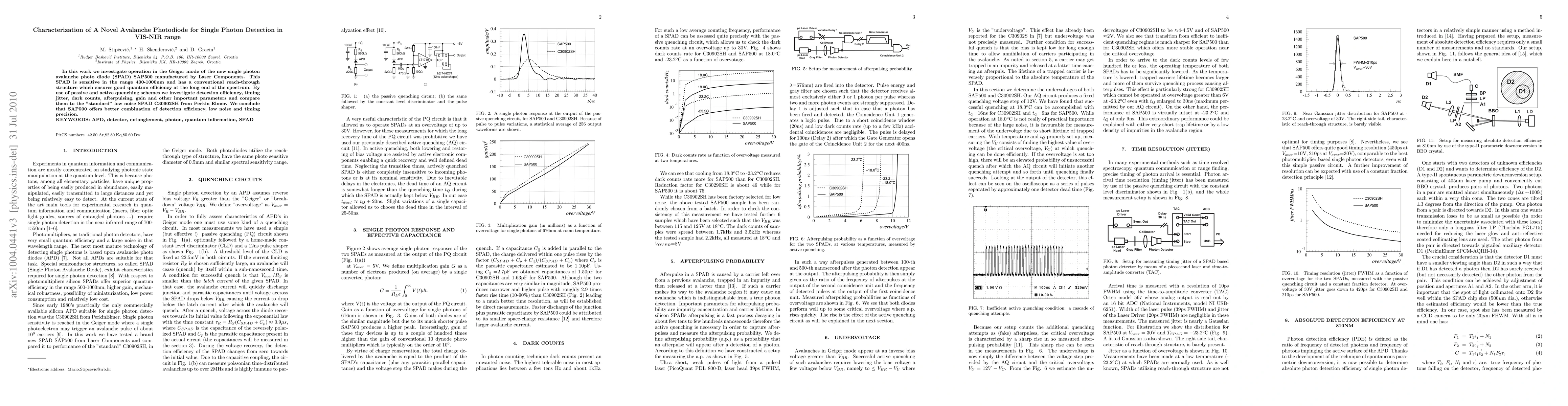 This paper characterizes a new single photon avalanche photodiode (SPAD) SAP500 for single photon detection in the 400-1000nm range, comparing its performance in terms of detection efficiency, timing jitter, and noise against a standard SPAD. The results show that SAP500 offers superior detection efficiency and timing precision.
