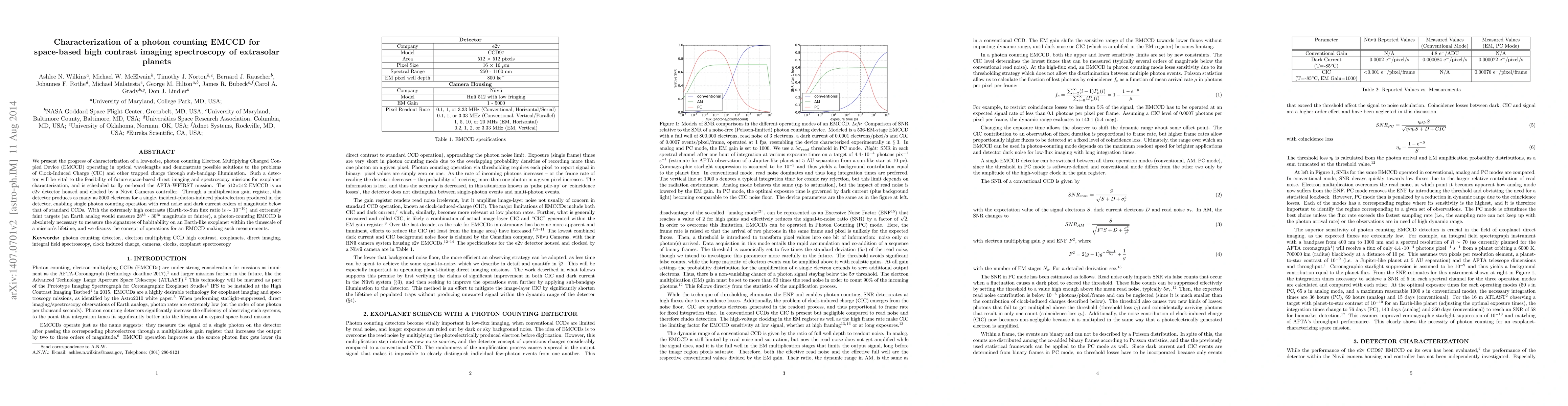 This paper characterizes a low-noise photon counting EMCCD for space-based high contrast imaging spectroscopy of extrasolar planets, addressing issues like Clock-Induced Charge. The EMCCD, with a multiplication gain of up to 5000 electrons per single photon, is crucial for detecting faint Earth-like exoplanets and will be flown on the AFTA-WFIRST mission.