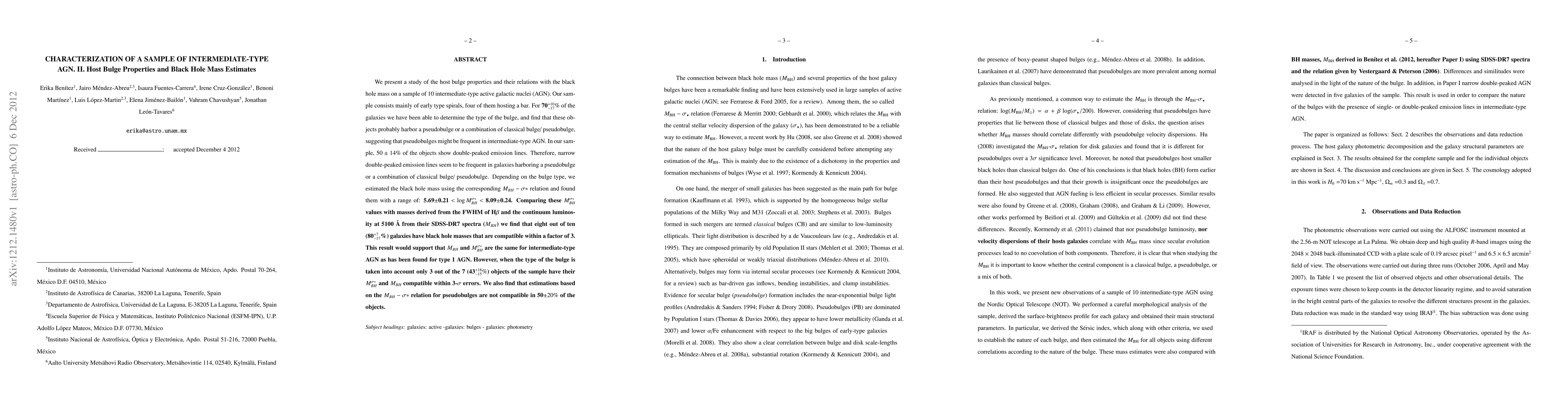 We present a study of the host bulge properties and their relations with the black hole mass on a sample of 10 intermediate-type active galactic nuclei (AGN). Our sample consists mainly of early type spirals, four of them hosting a bar. For 70$^{+10}_{-17}%$ of the galaxies we have been able to determine the type of the bulge, and find that these objects probably harbor a pseudobulge or a combination of classical bulge/ pseudobulge, suggesting that pseudobulges might be frequent in intermediate-type AGN. In our sample, 50\pm14% of the objects show double-peaked emission lines. Therefore, narrow double-peaked emission lines seem to be frequent in galaxies harboring a pseudobulge or a combination of classical bulge/ pseudobulge. Depending on the bulge type, we estimated the black hole mass using the corresponding $M_{BH} - {\sigma*}$ relation and found them with a range of: 5.69$\pm$0.21 $<$ $\log M_{BH}^{\sigma*}$ $<$ 8.09$\pm$0.24. Comparing these $M_{BH}^{\sigma*}$ values with masses derived from the FWHM of H$\beta$ and the continuum luminosity at 5100 \AA from their SDSS-DR7 spectra ($M_{BH}$) we find that eight out of ten (80$^{+7}_{-17}$%) galaxies have black hole masses that are compatible within a factor of 3. This result would support that $M_{BH}$ and $M_{BH}^{\sigma*}$ are the same for intermediate-type AGN as has been found for type 1 AGN. However, when the type of the bulge is taken into account only 3 out of the 7 (43$^{+18}_{-15}%$) objects of the sample have their $M_{BH}^{\sigma*}$ and $M_{BH}$ compatible within 3-$\sigma$ errors. We also find that estimations based on the $M_{BH}-\sigma*$ relation for pseudobulges are not compatible in 50$\pm20%$ of the objects.