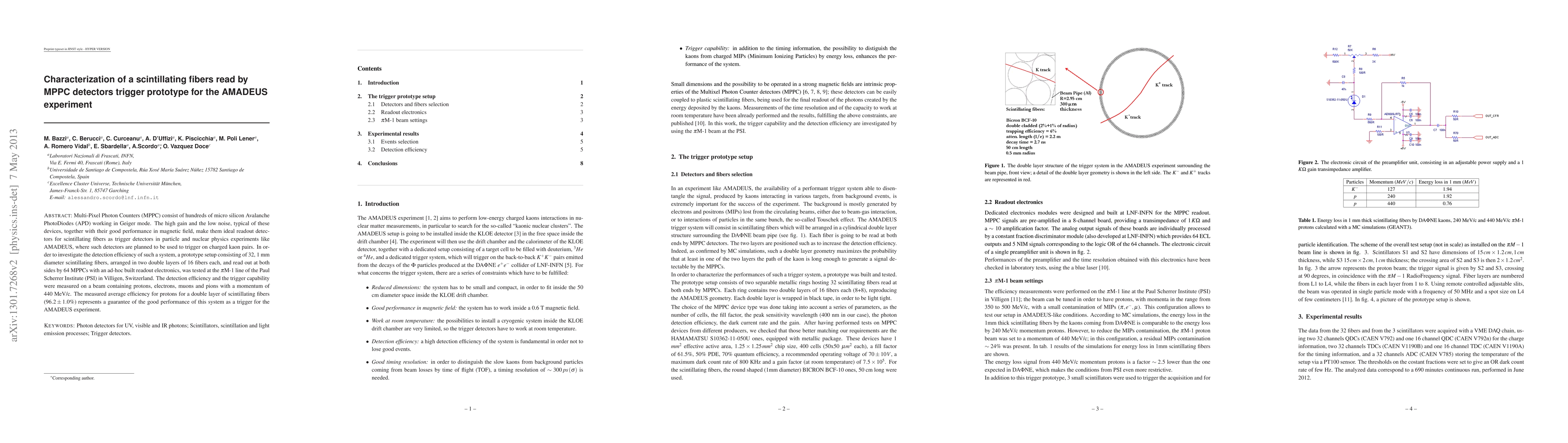 This study investigates the detection efficiency of scintillating fibers read by Multi-Pixel Photon Counters (MPPC) in the AMADEUS experiment, achieving an average efficiency of 96.9% for protons in a double layer setup, demonstrating the system's potential as a trigger for charged kaon pairs.