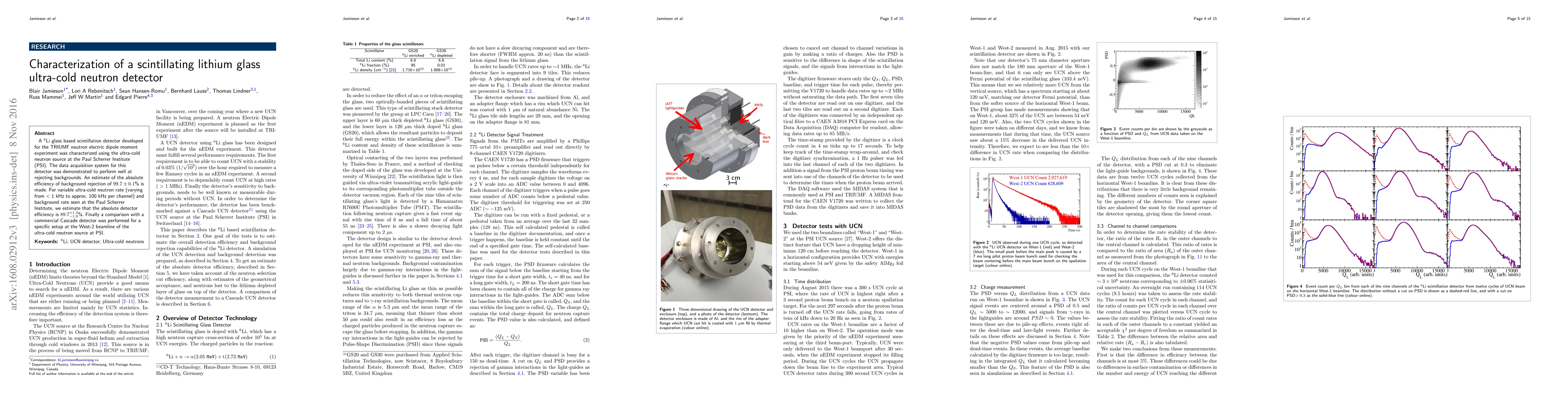 A $^{6}$Li glass based scintillation detector developed for the TRIUMF neutron electric dipole moment experiment was characterized using the ultra-cold neutron source at the Paul Scherrer Institute (PSI). The data acquisition system for this detector was demonstrated to perform well at rejecting backgrounds. An estimate of the absolute efficiency of background rejection of $99.7\pm0.1$% is made. For variable ultra-cold neutron rate (varying from $<$1 kHz to approx. 100 kHz per channel) and background rate seen at the Paul Scherrer Institute, we estimate that the absolute detector efficiency is $89.7^{+1.3}_{-1.9}$%. Finally a comparison with a commercial Cascade detector was performed for a specific setup at the West-2 beamline of the ultra-cold neutron source at PSI.