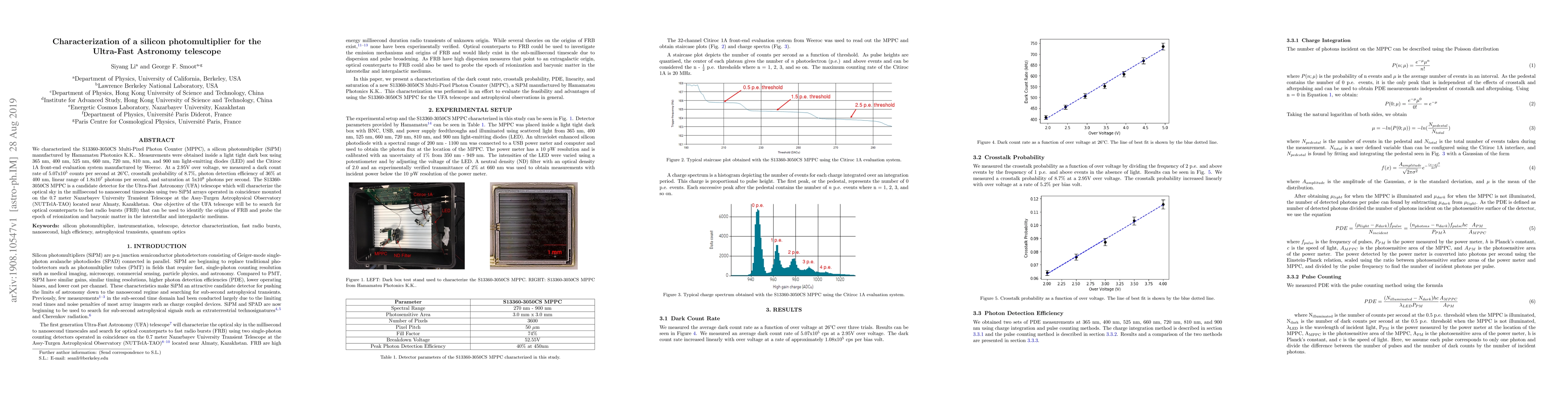 We characterized the S13360-3050CS Multi-Pixel Photon Counter (MPPC), a silicon photomultiplier (SiPM) manufactured by Hamamatsu Photonics K.K.. Measurements were obtained inside a light tight dark box using 365 nm, 400 nm, 525 nm, 660 nm, 720 nm, 810 nm, and 900 nm light-emitting diodes (LED) and the Citiroc 1A front-end evaluation system manufactured by Weeroc. At a 2.95V over voltage, we measured a dark count rate of 5.07x$10^{5}$ counts per second at 26$^{\circ}$C, crosstalk probability of 8.7$\%$, photon detection efficiency of 36$\%$ at 400 nm, linear range of 1.8x$10^{7}$ photons per second, and saturation at 5x$10^8$ photons per second. The S13360-3050CS MPPC is a candidate detector for the Ultra-Fast Astronomy (UFA) telescope which will characterize the optical sky in the millisecond to nanosecond timescales using two SiPM arrays operated in coincidence mounted on the 0.7 meter Nazarbayev University Transient Telescope at the Assy-Turgen Astrophysical Observatory (NUTTelA-TAO) located near Almaty, Kazakhstan. One objective of the UFA telescope will be to search for optical counterparts to fast radio bursts (FRB) that can be used to identify the origins of FRB and probe the epoch of reionization and baryonic matter in the interstellar and intergalactic mediums.