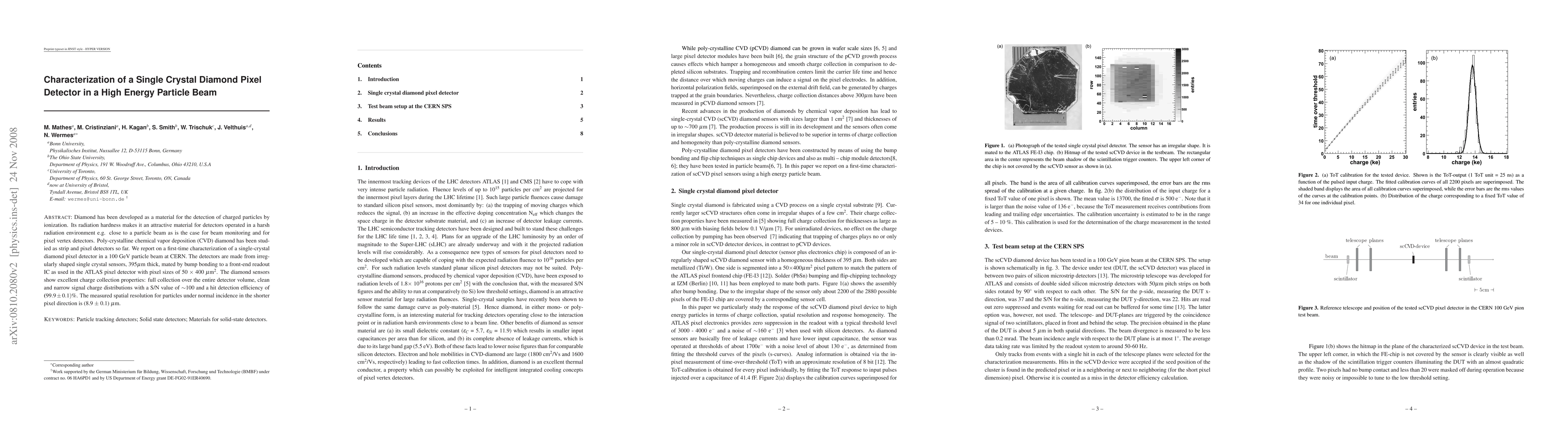 This paper characterizes a single-crystal diamond pixel detector in a 100 GeV particle beam at CERN, demonstrating excellent charge collection, high signal-to-noise ratio, and spatial resolution of (8.9 ± 0.1) µm, making it suitable for harsh radiation environments.