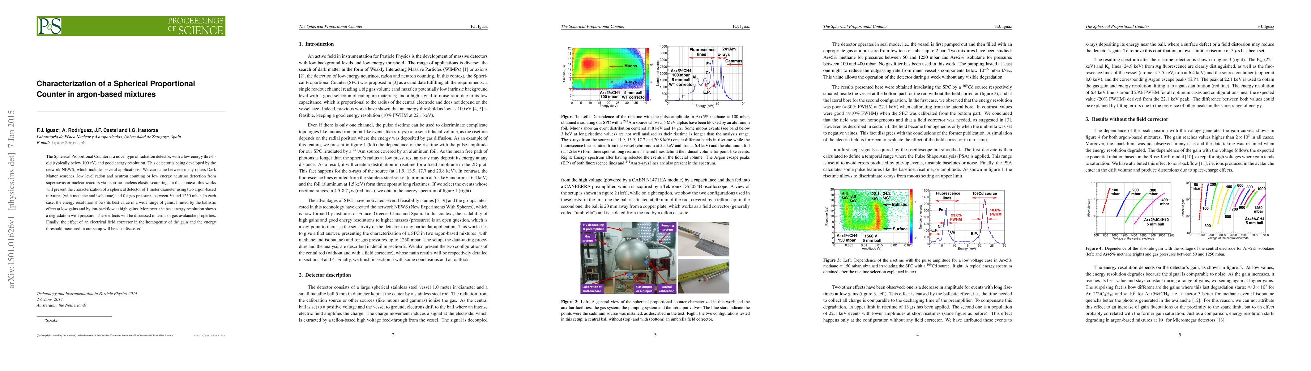 This paper characterizes a spherical proportional counter using argon-based mixtures for detecting low-energy radiation, showing optimal energy resolution at specific gains, while discussing degradation with pressure and the role of an electrical field corrector in gain uniformity.