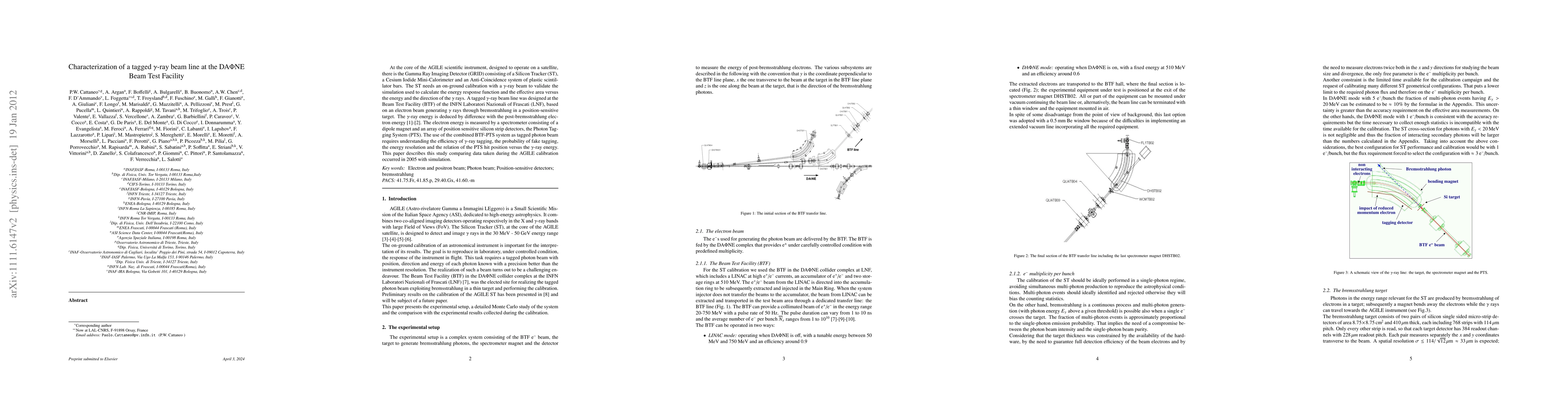 At the core of the AGILE scientific instrument, designed to operate on a satellite, there is the Gamma Ray Imaging Detector (GRID) consisting of a Silicon Tracker (ST), a Cesium Iodide Mini-Calorimeter and an Anti-Coincidence system of plastic scintillator bars. The ST needs an on-ground calibration with a $\gamma$-ray beam to validate the simulation used to calculate the energy response function and the effective area versus the energy and the direction of the $\gamma$ rays. A tagged $\gamma$-ray beam line was designed at the Beam Test Facility (BTF) of the INFN Laboratori Nazionali of Frascati (LNF), based on an electron beam generating $\gamma$ rays through bremsstrahlung in a position-sensitive target. The $\gamma$-ray energy is deduced by difference with the post-bremsstrahlung electron energy \cite{prest}-\cite{hasan}. The electron energy is measured by a spectrometer consisting of a dipole magnet and an array of position sensitive silicon strip detectors, the Photon Tagging System (PTS). The use of the combined BTF-PTS system as tagged photon beam requires understanding the efficiency of $\gamma$-ray tagging, the probability of fake tagging, the energy resolution and the relation of the PTS hit position versus the $\gamma$-ray energy. This paper describes this study comparing data taken during the AGILE calibration occurred in 2005 with simulation.