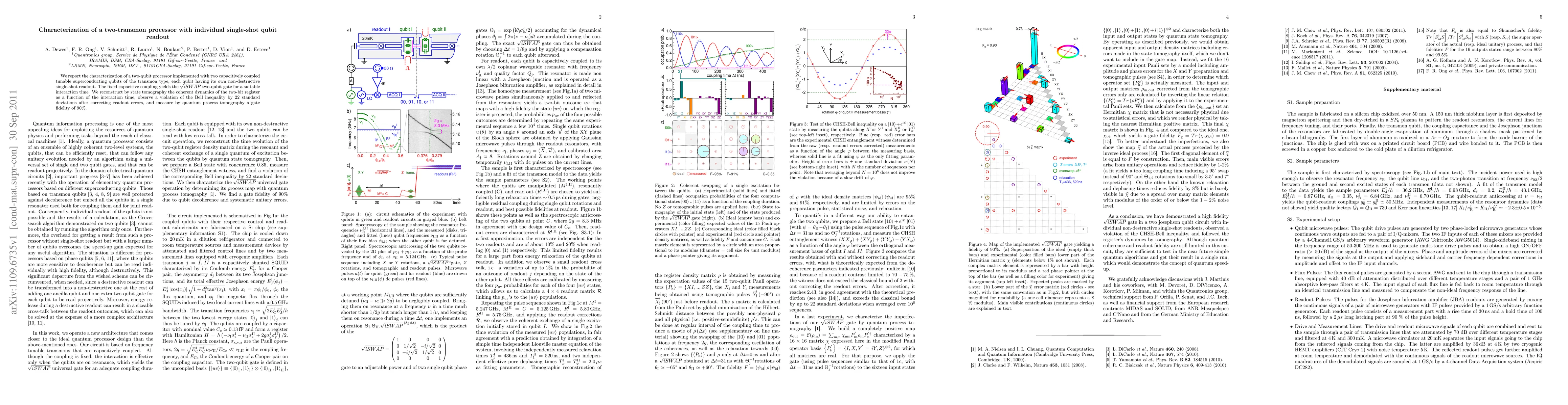 This paper characterizes a two-qubit processor using tunable superconducting transmon qubits with individual single-shot readout, demonstrating a \sqrt{iSWAP} gate and achieving a gate fidelity of 90%, while also showing a significant violation of the Bell inequality.