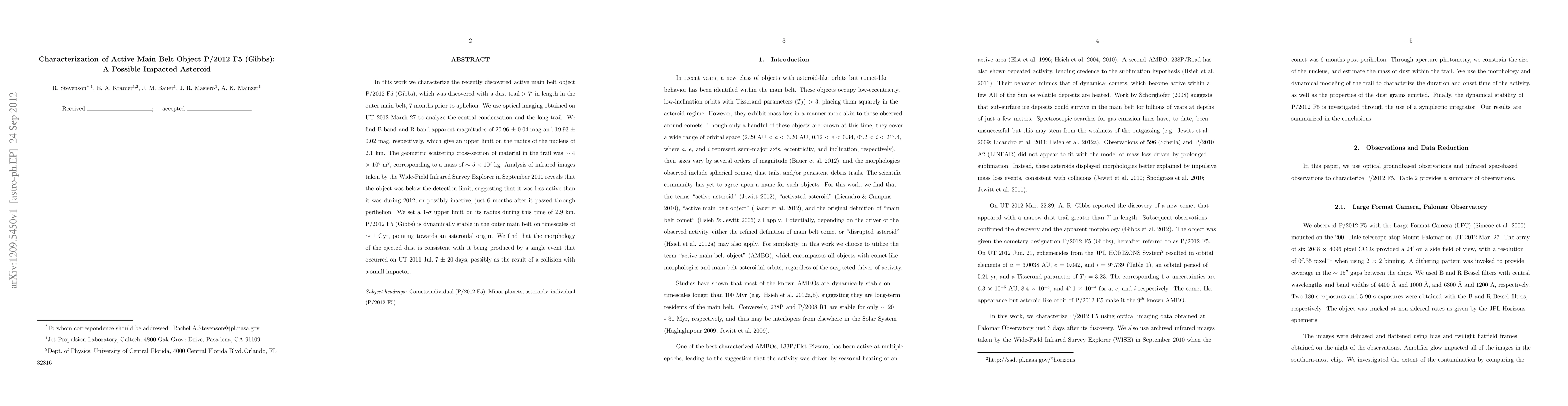 In this work we characterize the recently discovered active main belt object P/2012 F5 (Gibbs), which was discovered with a dust trail > 7' in length in the outer main belt, 7 months prior to aphelion. We use optical imaging obtained on UT 2012 March 27 to analyze the central condensation and the long trail. We find nuclear B-band and R-band apparent magnitudes of 20.96 and 19.93 mag, respectively, which give an upper limit on the radius of the nucleus of 2.1 km. The geometric cross-section of material in the trail was ~ 4 x 10^8 m^2, corresponding to a dust mass of ~ 5 x 10^7 kg. Analysis of infrared images taken by the Wide-Field Infrared Survey Explorer in September 2010 reveals that the object was below the detection limit, suggesting that it was less active than it was during 2012, or possibly inactive, just 6 months after it passed through perihelion. We set a 1-sigma upper limit on its radius during this time of 2.9 km. P/2012 F5 (Gibbs) is dynamically stable in the outer main belt on timescales of ~ 1 Gyr, pointing towards an asteroidal origin. We find that the morphology of the ejected dust is consistent with it being produced by a single event that occurred on UT 2011 July 7 $\pm$ 20 days, possibly as the result of a collision with a small impactor.