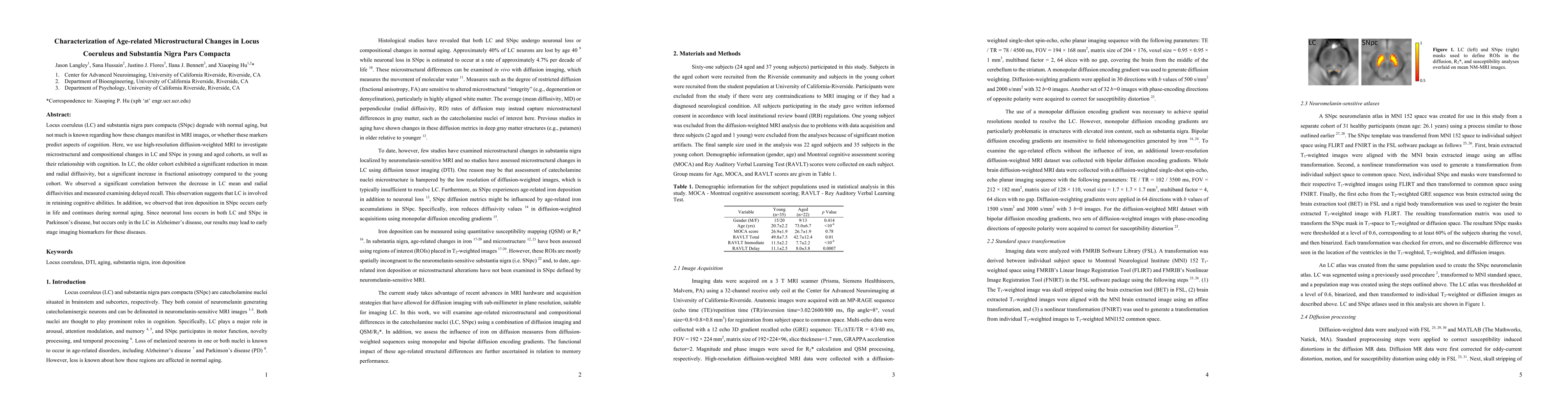 Aging affects microstructural changes in brain regions LC and SNpc, as seen in reduced diffusivity and increased anisotropy, potentially linked to cognitive decline and neurodegenerative diseases like Parkinson's and Alzheimer's.
