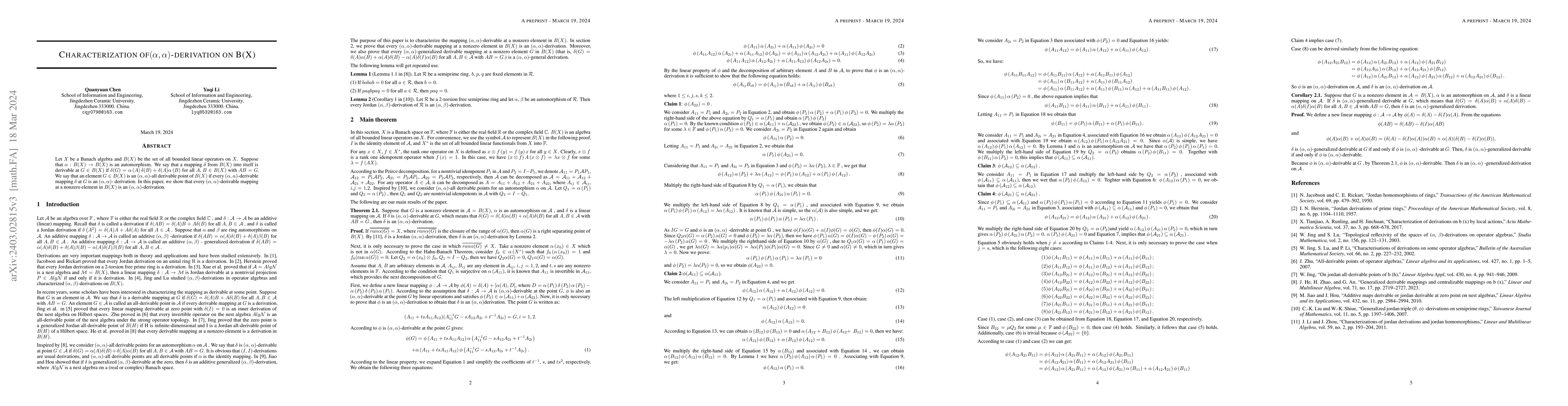 This paper investigates $(\alpha,\alpha)$-derivations on the set $B(X)$ of bounded linear operators on a Banach algebra $X$, proving that any $(\alpha,\alpha)$-derivable mapping at a nonzero element is an $(\alpha,\alpha)$-derivation.