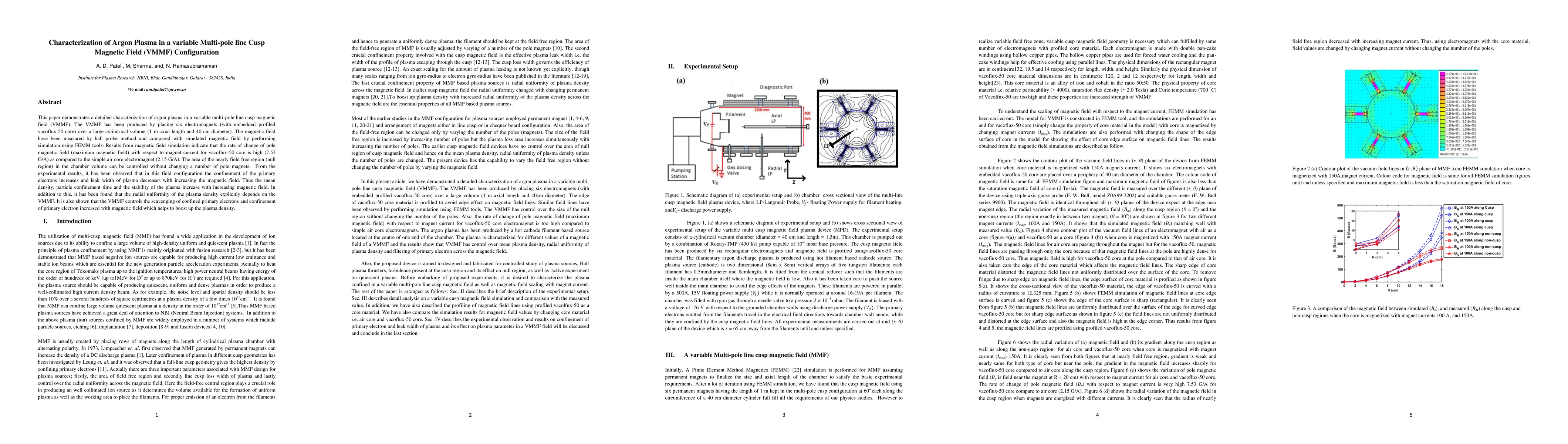 This paper demonstrates a detailed characterization of argon plasma in a variable multi-pole line cusp magnetic field (VMMF). The VMMF has been produced by placing six electromagnets (with embedded profiled vacoflux-50 core) over a large cylindrical volume (1 m axial length and 40 cm diameter). The magnetic field have been measured by hall probe method and compared with simulated magnetic field by performing simulation using FEMM tools. Results from magnetic field simulation indicate that the rate of change of pole magnetic field (maximum magnetic field) with respect to magnet current for vacoflux-50 core is high (7.53 G/A) as compared to the simple air core electromagnet (2.15 G/A). The area of the nearly field free region (null region) in the chamber volume can be controlled without changing a number of pole magnets. From the experimental results, it has been observed that in this field configuration the confinement of the primary electrons increases and leak width of plasma decreases with increasing the magnetic field. Thus the mean density, particle confinement time and the stability of the plasma increase with increasing magnetic field. In addition to this, it has been found that the radial uniformity of the plasma density explicitly depends on the VMMF. It is also shown that the VMMF controls the scavenging of confined primary electrons and confinement of primary electron increased with magnetic field which helps to boost up the plasma density.