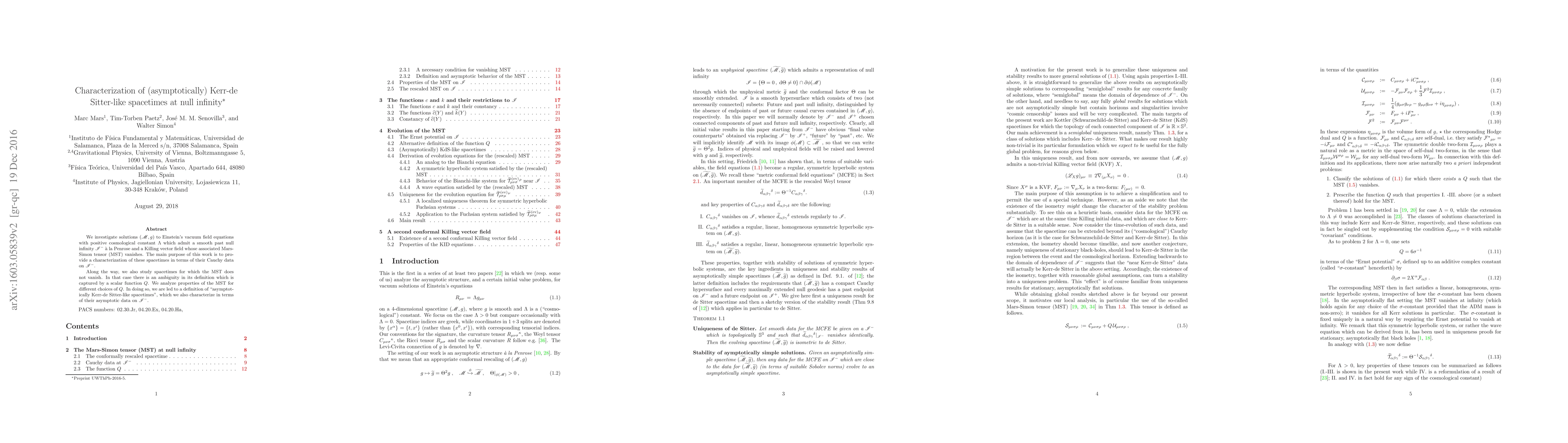 We investigate solutions $(\mathcal{M}, g)$ to Einstein's vacuum field equations with positive cosmological constant $\Lambda$ which admit a smooth past null infinity $\mathcal{J}^-$ \`a la Penrose and a Killing vector field whose associated Mars-Simon tensor (MST) vanishes. The main purpose of this work is to provide a characterization of these spacetimes in terms of their Cauchy data on $\mathcal{J}^-$. Along the way, we also study spacetimes for which the MST does not vanish. In that case there is an ambiguity in its definition which is captured by a scalar function $Q$. We analyze properties of the MST for different choices of $Q$. In doing so, we are led to a definition of "asymptotically Kerr-de Sitter-like spacetimes", which we also characterize in terms of their asymptotic data on $\mathcal{J}^-$.