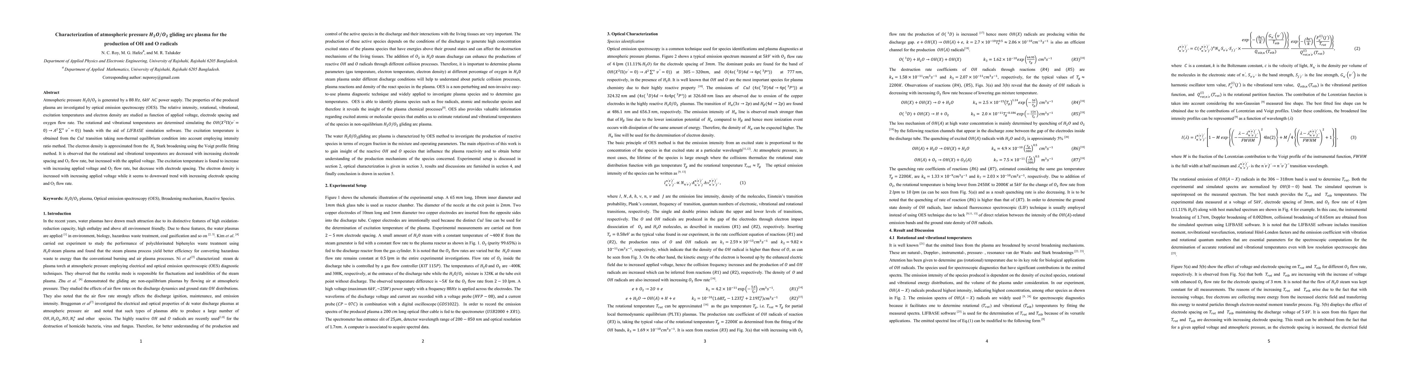 Atmospheric pressure steam/oxygen plasma is generated by a 88 Hz, 6kV AC power supply. The properties of the produced plasma are investigated by optical emission spectroscopy (OES). The relative intensity, rotational, vibrational, excitation temperatures and electron density are studied as function of applied voltage, electrode spacing and oxygen flow rate. The rotational and vibrational temperatures are determined simulating the bands with the aid of LIFBASE simulation software. The excitation temperature is obtained from the CuI transition taking non-thermal equilibrium condition into account employing intensity ratio method. The electron density is approximated from the H_{\alpha} Stark broadening using the Voigt profile fitting method. It is observed that the rotational and vibrational temperatures are decreased with increasing electrode spacing and O2 flow rate, but increased with the applied voltage. The excitation temperature is found to increase with increasing applied voltage and O2 flow rate, but decrease with electrode spacing. The electron density is increased with increasing applied voltage while it seems to downward trend with increasing electrode spacing and O2 flow rate.