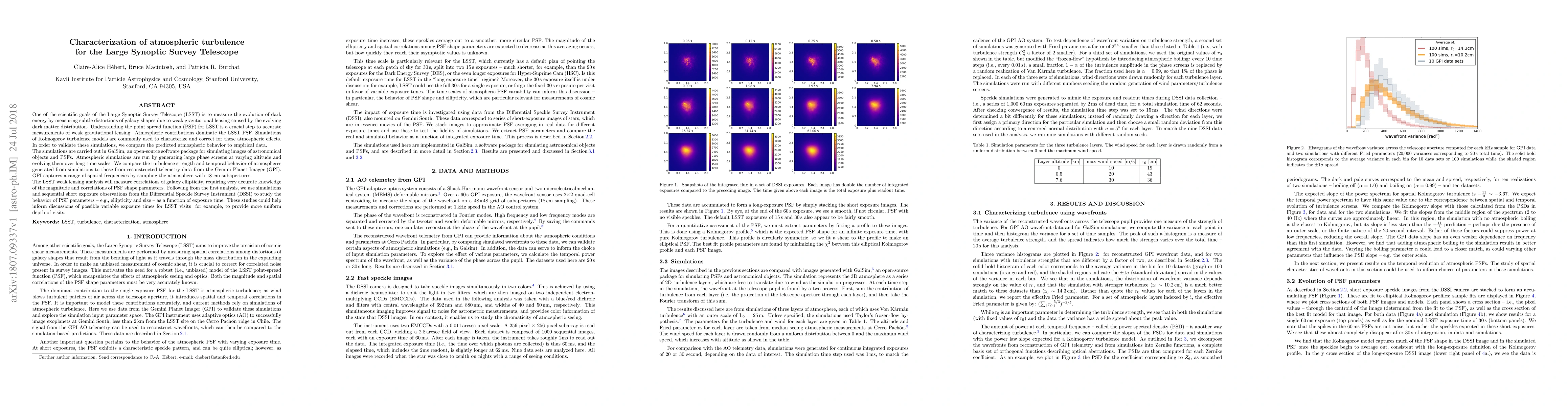 One of the scientific goals of the Large Synoptic Survey Telescope (LSST) is to measure the evolution of dark energy by measuring subtle distortions of galaxy shapes due to weak gravitational lensing caused by the evolving dark matter distribution. Understanding the point spread function (PSF) for LSST is a crucial step to accurate measurements of weak gravitational lensing. Atmospheric contributions dominate the LSST PSF. Simulations of Kolmogorov turbulence models are commonly used to characterize and correct for these atmospheric effects. In order to validate these simulations, we compare the predicted atmospheric behavior to empirical data. The simulations are carried out in GalSim, an open-source software package for simulating images of astronomical objects and PSFs. Atmospheric simulations are run by generating large phase screens at varying altitude and evolving them over long time scales. We compare the turbulence strength and temporal behavior of atmospheres generated from simulations to those from reconstructed telemetry data from the Gemini Planet Imager (GPI). GPI captures a range of spatial frequencies by sampling the atmosphere with 18-cm subapertures. The LSST weak lensing analysis will measure correlations of galaxy ellipticity, requiring very accurate knowledge of the magnitude and correlations of PSF shape parameters. Following from the first analysis, we use simulations and sequential short exposure observations from the Differential Speckle Survey Instrument (DSSI) to study the behavior of PSF parameters - e.g., ellipticity and size - as a function of exposure time. These studies could help inform discussions of possible variable exposure times for LSST visits for example, to provide more uniform depth of visits.