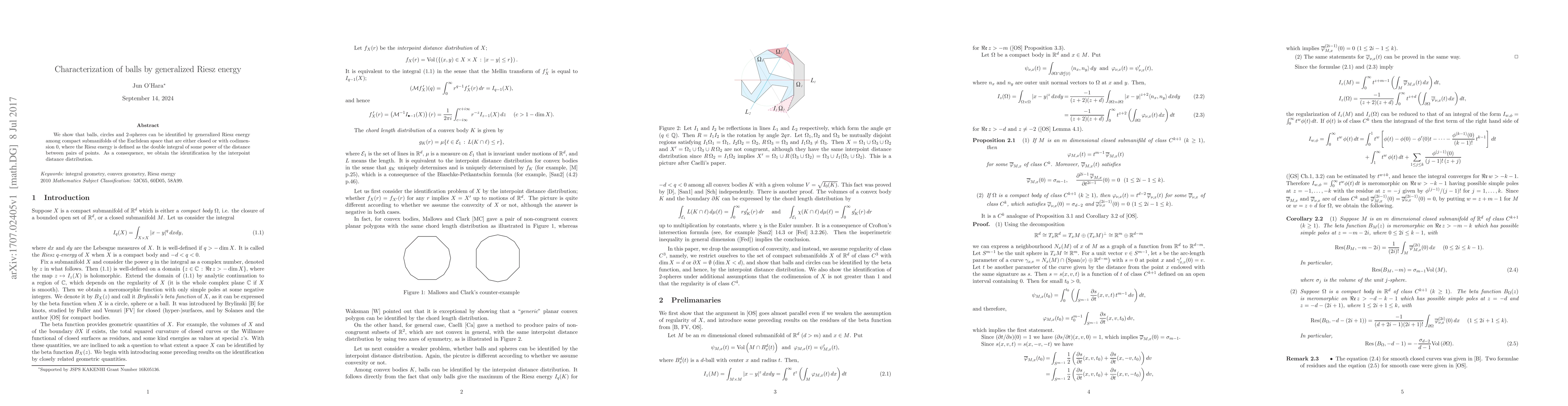 We show that balls, circles and 2-spheres can be identified by generalized Riesz energy among compact submanifolds of the Euclidean space that are either closed or with codimension 0, where the Riesz energy is defined as the double integral of some power of the distance between pairs of points. As a consequence, we obtain the identification by the interpoint distance distribution.