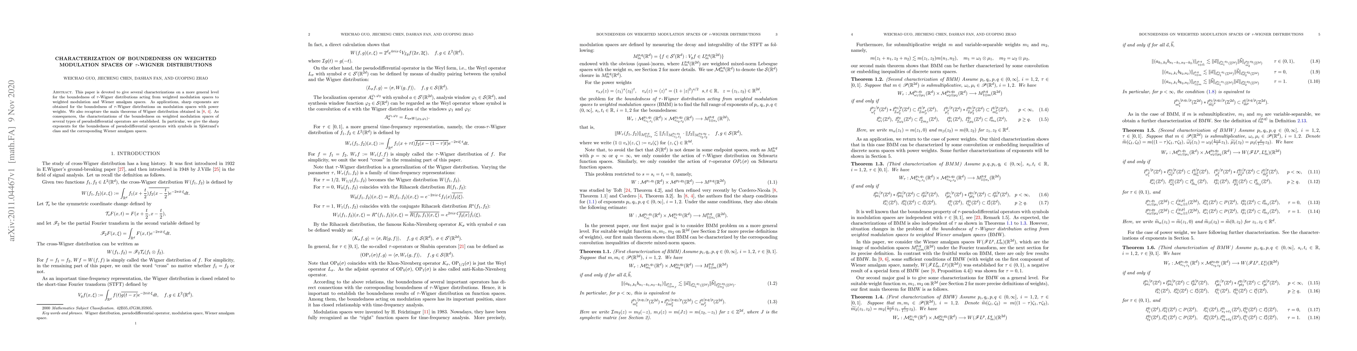 This paper is devoted to give several characterizations on a more general level for the boundedness of $\tau$-Wigner distributions acting from weighted modulation spaces to weighted modulation and Wiener amalgam spaces. As applications, sharp exponents are obtained for the boundedness of $\tau$-Wigner distributions on modulation spaces with power weights. We also recapture the main theorems of Wigner distribution obtained in \cite{CorderoNicola2018IMRNI,Cordero2020a}. As consequences, the characterizations of the boundedness on weighted modulation spaces of several types of pseudodifferential operators are established. In particular, we give the sharp exponents for the boundedness of pseudodifferential operators with symbols in Sj\"{o}strand's class and the corresponding Wiener amalgam spaces.