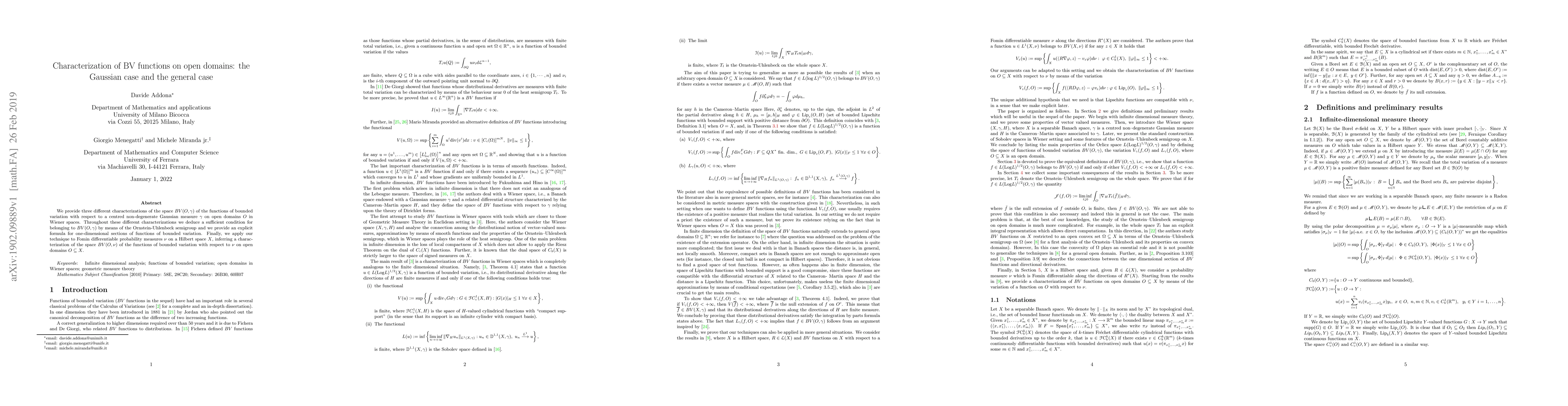 We provide three different characterizations of the space $BV(O,\gamma)$ of the functions of bounded variation with respect to a centred non-degenerate Gaussian measure $ \gamma$ on open domains $O$ in Wiener spaces. Throughout these different characterizations we deduce a sufficient condition for belonging to $BV(O,\gamma)$ by means of the Ornstein-Uhlenbeck semigroup and we provide an explicit formula for one-dimensional sections of functions of bounded variation. Finally, we apply our technique to Fomin differentiable probability measures $\nu$ on a Hilbert space $X$, inferring a characterization of the space $BV(O,\nu)$ of the functions of bounded variation with respect to $\nu$ on open domains $O\subseteq X$.