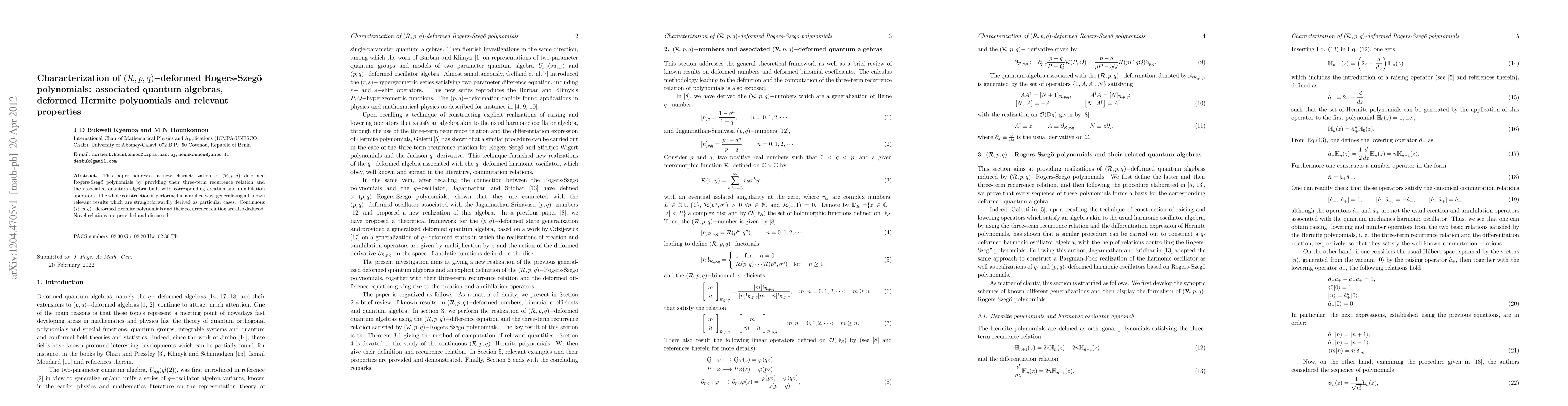 This paper introduces a new characterization of $({\cal R},p,q)-$deformed Rogers-Szegő polynomials through their three-term recurrence relation and associated quantum algebra, generalizing known results and introducing continuous deformed Hermite polynomials.