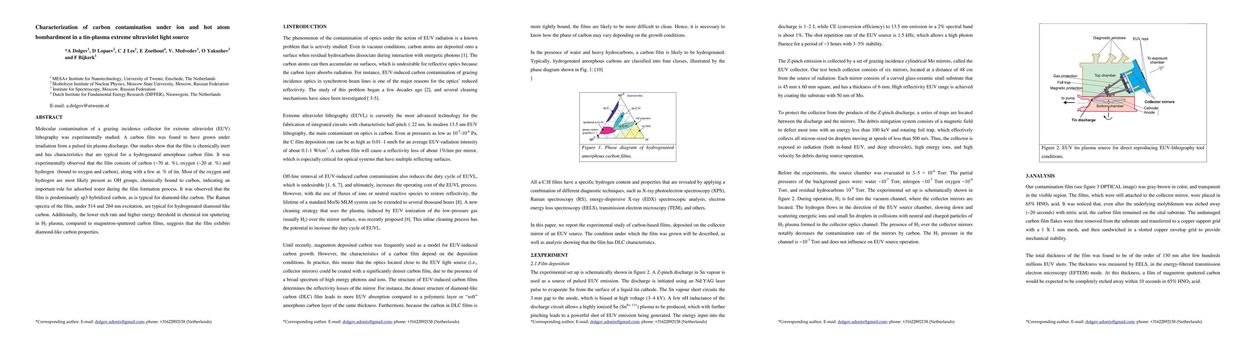 Molecular contamination of a grazing incidence collector for extreme ultraviolet (EUV) lithography was experimentally studied. A carbon film was found to have grown under irradiation from a pulsed tin plasma discharge. Our studies show that the film is chemically inert and has characteristics that are typical for a hydrogenated amorphous carbon film. It was experimentally observed that the film consists of carbon (~70 at. %), oxygen (~20 at. %) and hydrogen (bound to oxygen and carbon), along with a few at. % of tin. Most of the oxygen and hydrogen are most likely present as OH groups, chemically bound to carbon, indicating an important role for adsorbed water during the film formation process. It was observed that the film is predominantly sp3 hybridized carbon, as is typical for diamond-like carbon. The Raman spectra of the film, under 514 and 264 nm excitation, are typical for hydrogenated diamond-like carbon. Additionally, the lower etch rate and higher energy threshold in chemical ion sputtering in H2 plasma, compared to magnetron-sputtered carbon films, suggests that the film exhibits diamond-like carbon properties.