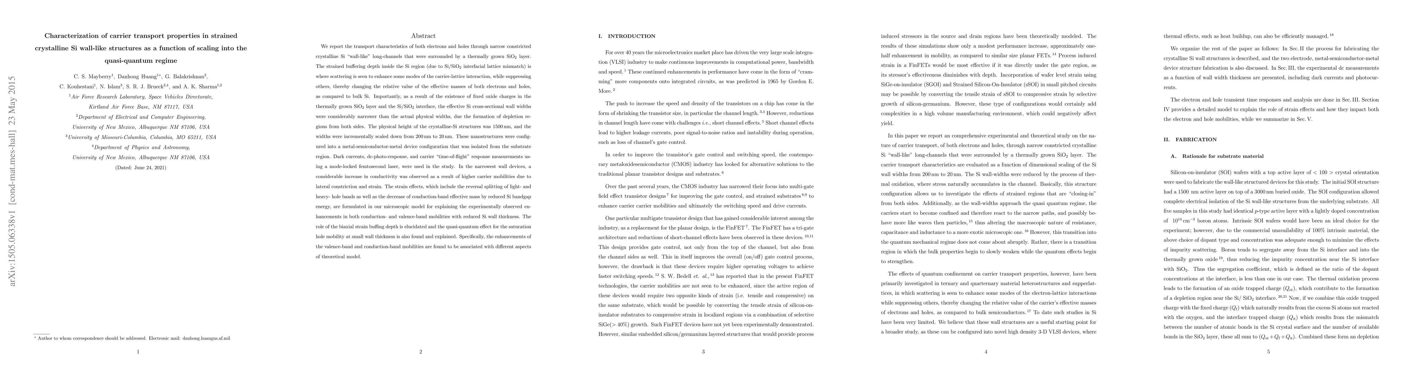 We report the transport characteristics of both electrons and holes through narrow constricted crystalline Si "wall-like" long-channels that were surrounded by a thermally grown SiO2 layer. Importantly, as a result of the existence of fixed oxide charges in the thermally grown SiO2 layer and the Si/SiO2 interface, the effective Si cross-sectional wall widths were considerably narrower than the actual physical widths, due the formation of depletion regions from both sides. These nanostructures were configured into a metal-semiconductor-metal device configuration that was isolated from the substrate region. Dark currents, dc-photo-response, and carrier "time-of-flight" response measurements using a mode-locked femtosecond laser, were used in the study. In the narrowest wall devices, a considerable increase in conductivity was observed as a result of higher carrier mobilities due to lateral constriction and strain. The strain effects, which include the reversal splitting of light- and heavy- hole bands as well as the decrease of conduction-band effective mass by reduced Si bandgap energy, are formulated in our microscopic model for explaining the experimentally observed enhancements in both conduction- and valence-band mobilities with reduced Si wall thickness. The role of the biaxial strain buffing depth is elucidated and the quasi-quantum effect for the saturation hole mobility at small wall thickness is also found and explained. Specifically, the enhancements of the valence-band and conduction-band mobilities are found to be associated with different aspects of theoretical model.