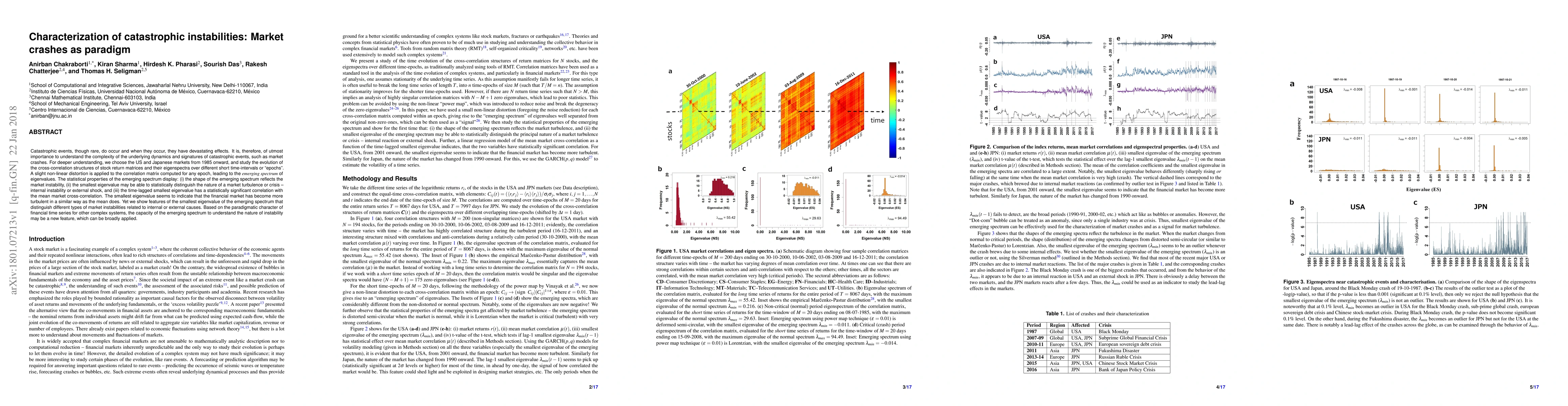 Catastrophic events, though rare, do occur and when they occur, they have devastating effects. It is, therefore, of utmost importance to understand the complexity of the underlying dynamics and signatures of catastrophic events, such as market crashes. For deeper understanding, we choose the US and Japanese markets from 1985 onward, and study the evolution of the cross-correlation structures of stock return matrices and their eigenspectra over different short time-intervals or "epochs". A slight non-linear distortion is applied to the correlation matrix computed for any epoch, leading to the emerging spectrum of eigenvalues. The statistical properties of the emerging spectrum display: (i) the shape of the emerging spectrum reflects the market instability, (ii) the smallest eigenvalue may be able to statistically distinguish the nature of a market turbulence or crisis -- internal instability or external shock, and (iii) the time-lagged smallest eigenvalue has a statistically significant correlation with the mean market cross-correlation. The smallest eigenvalue seems to indicate that the financial market has become more turbulent in a similar way as the mean does. Yet we show features of the smallest eigenvalue of the emerging spectrum that distinguish different types of market instabilities related to internal or external causes. Based on the paradigmatic character of financial time series for other complex systems, the capacity of the emerging spectrum to understand the nature of instability may be a new feature, which can be broadly applied.