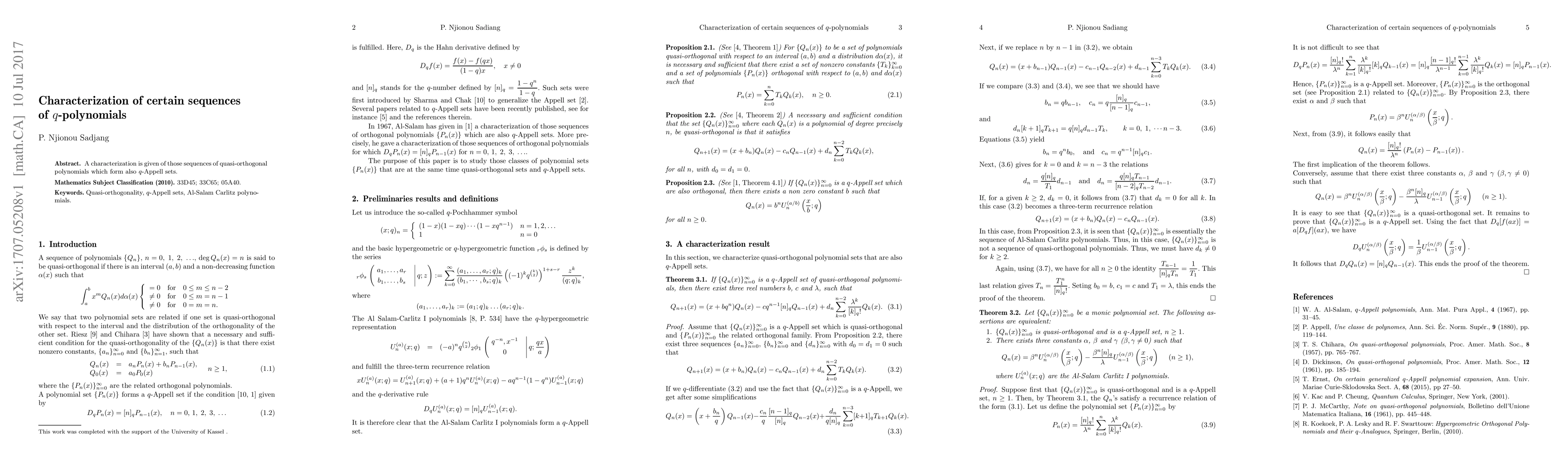 A characterization is given of those sequences of quasi-orthogonal polynomials which form also $q$-Appell sets.