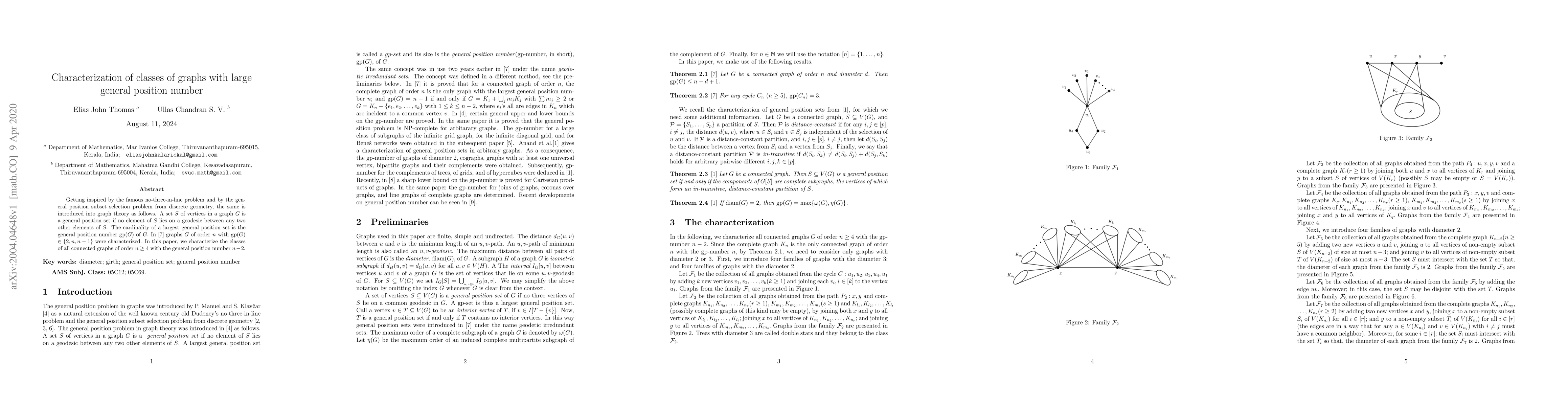 Getting inspired by the famous no-three-in-line problem and by the general position subset selection problem from discrete geometry, the same is introduced into graph theory as follows. A set $S$ of vertices in a graph $G$ is a general position set if no element of $S$ lies on a geodesic between any two other elements of $S$. The cardinality of a largest general position set is the general position number ${\rm gp}(G)$ of $G.$ In \cite{ullas-2016} graphs $G$ of order $n$ with ${\rm gp}(G)$ $\in \{2, n, n-1\}$ were characterized. In this paper, we characterize the classes of all connected graphs of order $n\geq 4$ with the general position number $n-2.$