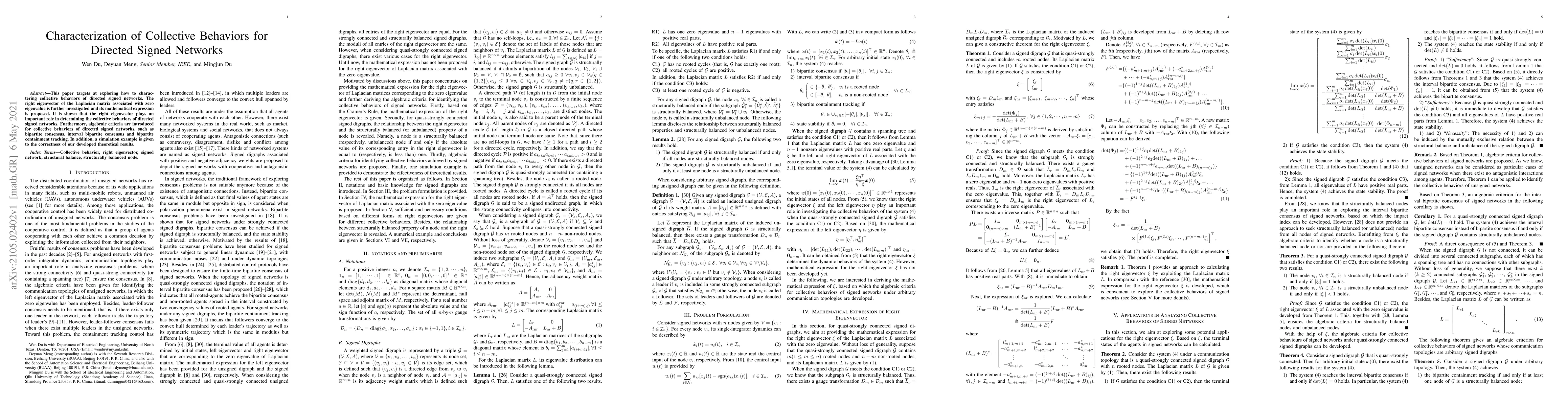 This paper investigates the collective behaviors in directed signed networks, proposing a mathematical expression for the right eigenvector of the Laplacian matrix's zero eigenvalue, which is crucial for these behaviors. It also introduces algebraic criteria for phenomena like bipartite consensus and provides a simulation to validate the theoretical findings.