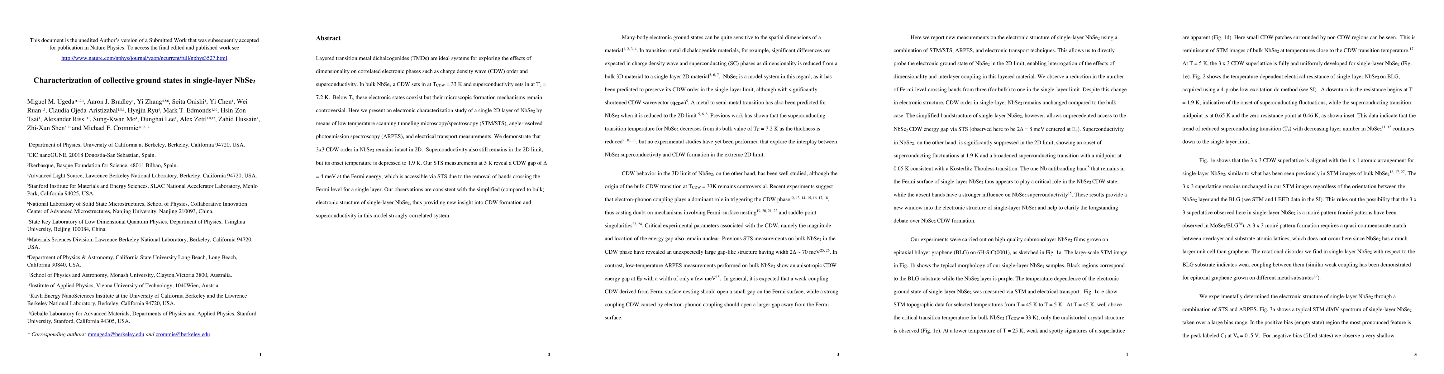 This study characterizes the collective ground states in single-layer NbSe2 using STM/STS, ARPES, and transport measurements, revealing that 3x3 CDW order and superconductivity persist in 2D, albeit with a reduced onset temperature for superconductivity to 1.9 K. The findings provide new insights into the mechanisms of CDW formation and superconductivity in this strongly correlated material.