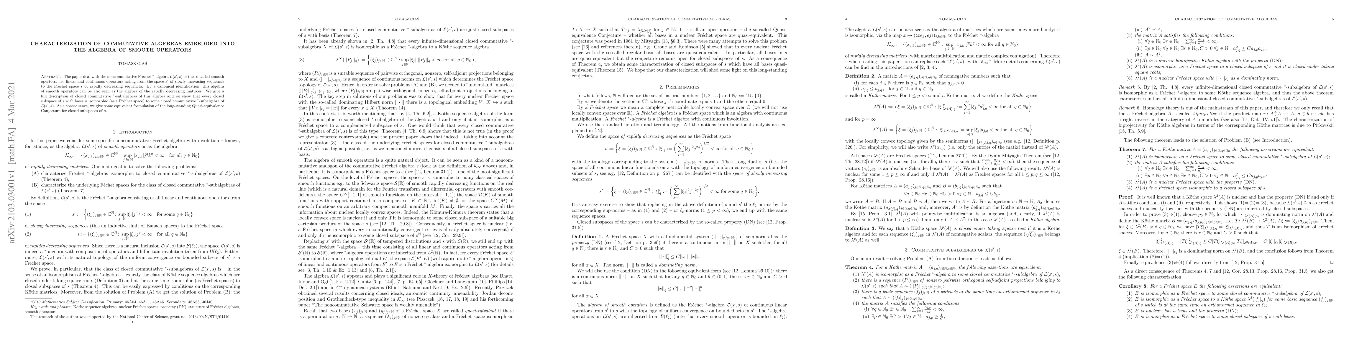 This paper characterizes closed commutative ${}^*$-subalgebras within the noncommutative Fr\'echet ${}^*$-algebra $\mathcal{L}(s',s)$ of smooth operators between spaces of sequences. It demonstrates that every closed subspace of $s$ with basis is isomorphic to some closed commutative ${}^*$-subalgebra of $\mathcal{L}(s',s)$, providing an equivalent formulation of the Quasi-equivalence Conjecture.