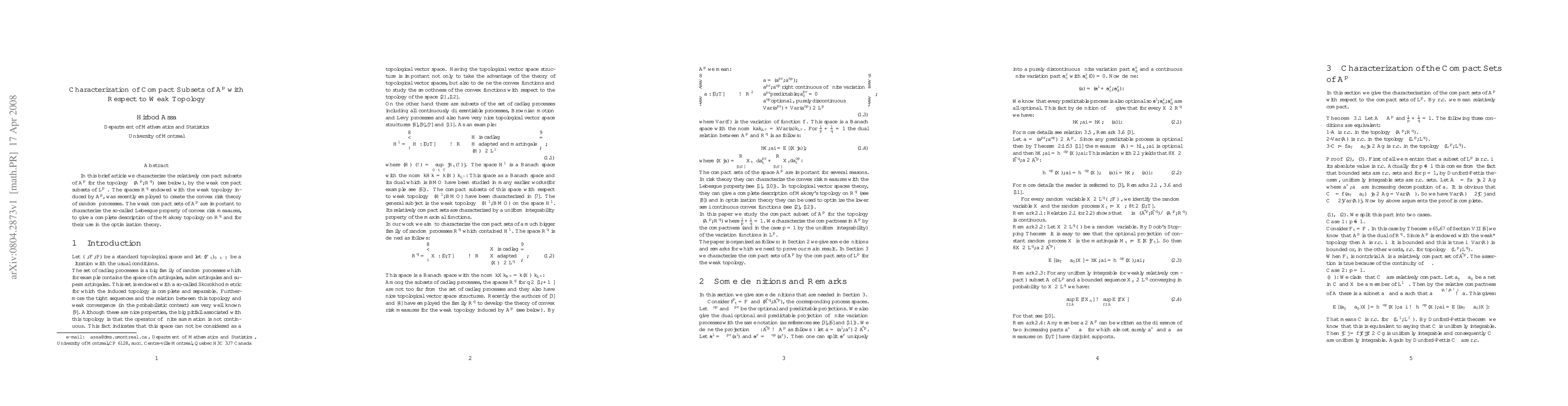 In this brief article we characterize the relatively compact subsets of $\mathcal{A}^p$ for the topology $\sigma(\mathcal{A}^p,\mathcal{R}^q)$ (see below), by the weak compact subsets of $L^p$ . The spaces $\mathcal{R}^q$ endowed with the weak topology induced by $\mathcal{A}^p$, was recently employed to create the convex risk theory of random processes. The weak compact sets of $\mathcal{A}^p$ are important to characterize the so-called Lebesgue property of convex risk measures, to give a complete description of the Makcey topology on $\mathcal{R}^q$ and for their use in the optimization theory.