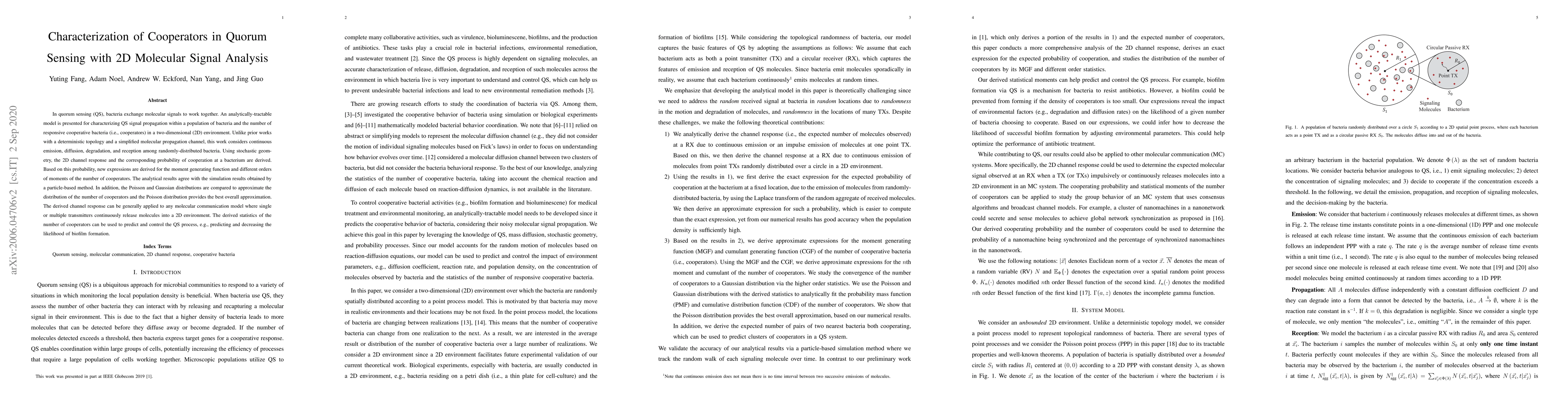 This paper presents an analytically-tractable model for quorum sensing signal propagation in a 2D environment, considering continuous emission, diffusion, degradation, and reception among randomly distributed bacteria. The study derives expressions for the probability of cooperation and the moments of cooperators, showing that the Poisson distribution best approximates the number of cooperators.