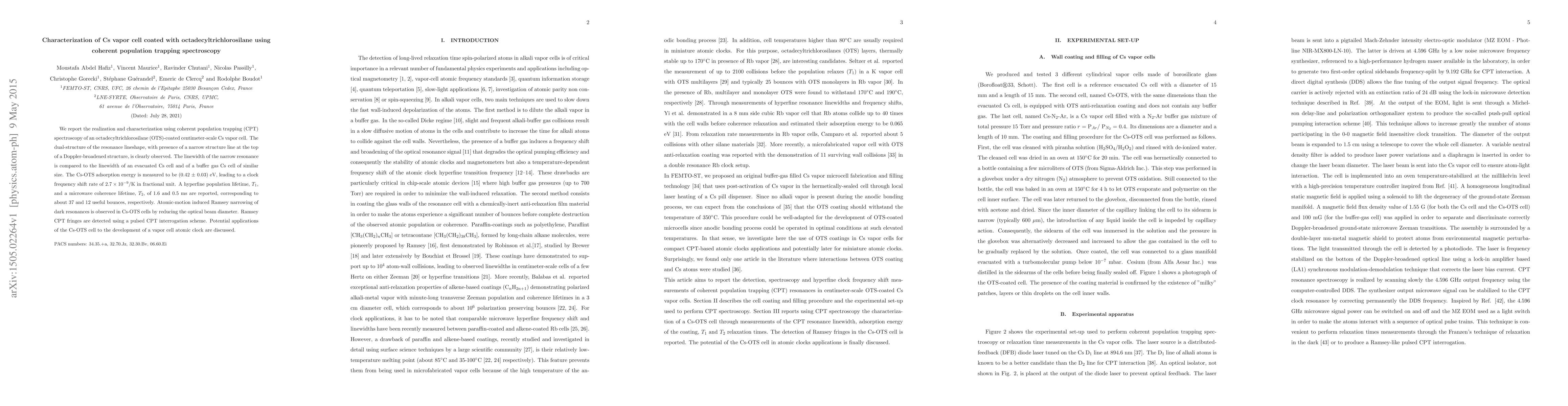 This paper describes the use of coherent population trapping (CPT) spectroscopy to characterize a Cs vapor cell coated with octadecyltrichlorosilane (OTS), observing a dual-structure resonance lineshape. The Cs-OTS adsorption energy and clock frequency shift rate are measured, along with hyperfine lifetimes and microwave coherence times, suggesting potential for vapor cell atomic clock development.