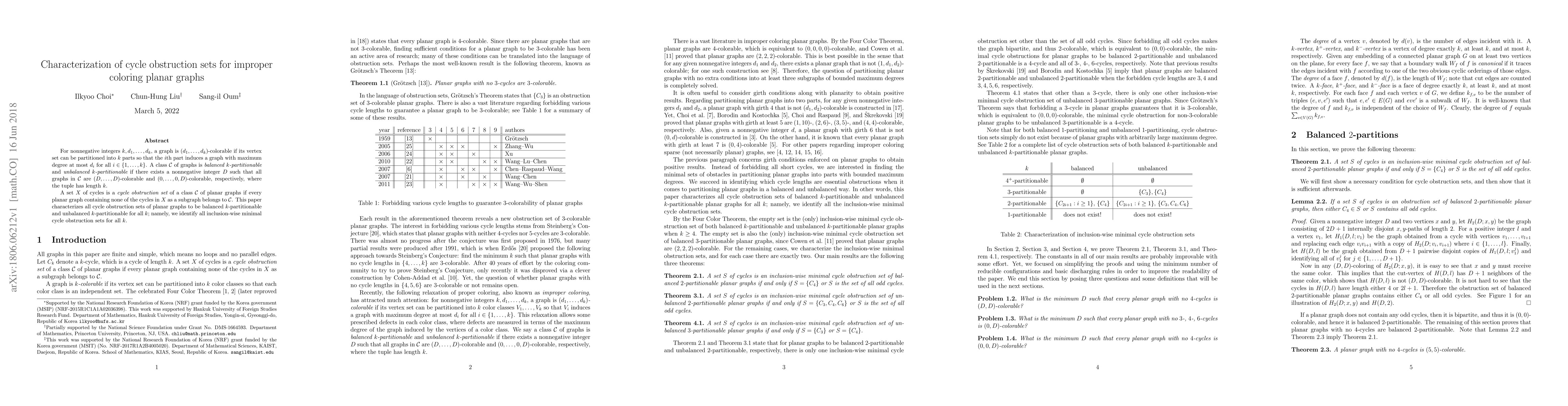 For nonnegative integers $k, d_1, \ldots, d_k$, a graph is $(d_1, \ldots, d_k)$-colorable if its vertex set can be partitioned into $k$ parts so that the $i$th part induces a graph with maximum degree at most $d_i$ for all $i\in\{1, \ldots, k\}$. A class $\mathcal C$ of graphs is {\it balanced $k$-partitionable} and {\it unbalanced $k$-partitionable} if there exists a nonnegative integer $D$ such that all graphs in $\mathcal C$ are $(D, \ldots, D)$-colorable and $(0, \ldots, 0, D)$-colorable, respectively, where the tuple has length $k$. A set $X$ of cycles is a {\it cycle obstruction set} of a class $\mathcal C$ of planar graphs if every planar graph containing none of the cycles in $X$ as a subgraph belongs to $\mathcal C$. This paper characterizes all cycle obstruction sets of planar graphs to be balanced $k$-partitionable and unbalanced $k$-partitionable for all $k$; namely, we identify all inclusion-wise minimal cycle obstruction sets for all $k$.