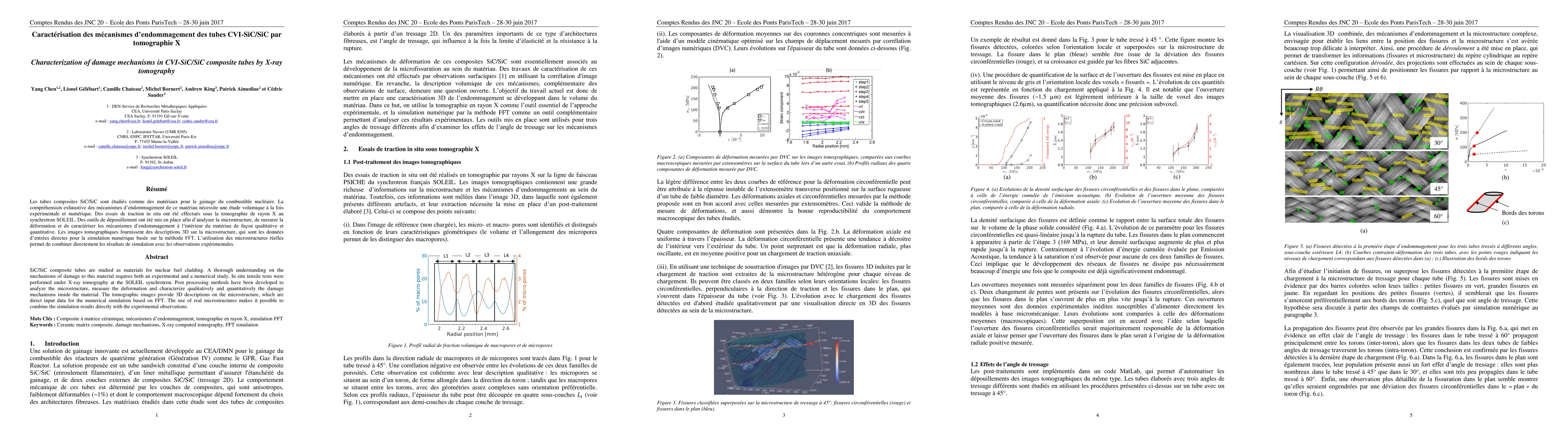 SiC/SiC composite tubes are studied as materials for nuclear fuel cladding. A thorough understanding on the mechanisms of damage to this material requires both an experimental and a numerical study. In situ tensile tests were performed under X-ray tomography at the SOLEIL synchrotron. Post processing methods have been developed to analyze the microstructure, measure the deformation and characterize qualitatively and quantitatively the damage mechanisms inside the material. The tomographic images provide 3D descriptions on the microstructure, which are direct input data for the numerical simulation based on FFT. The use of real microstructures makes it possible to combine the simulation results directly with the experimental observations.