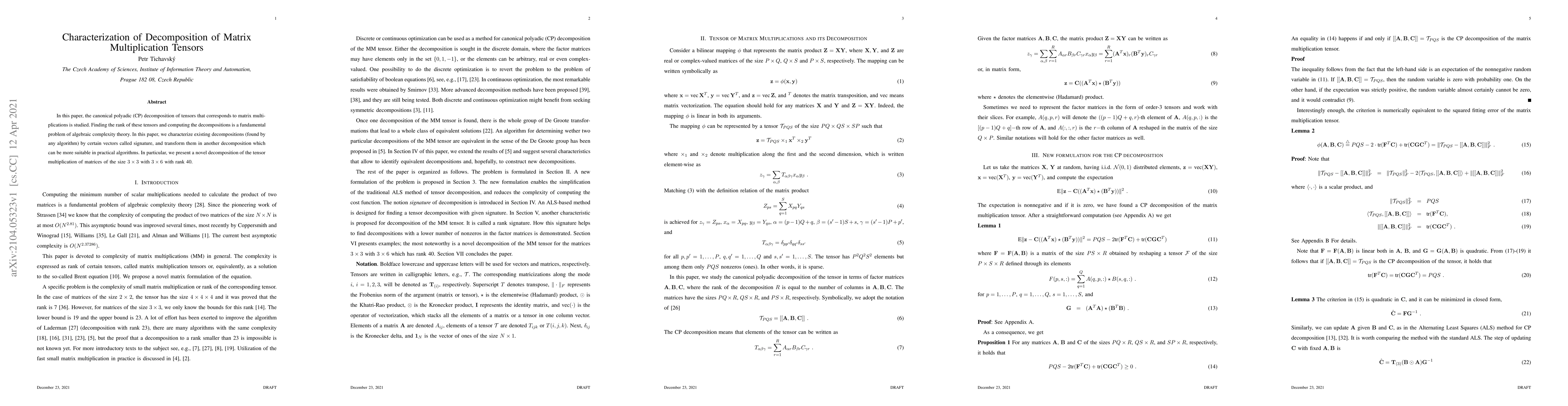 In this paper, the canonical polyadic (CP) decomposition of tensors that corresponds to matrix multiplications is studied. Finding the rank of these tensors and computing the decompositions is a fundamental problem of algebraic complexity theory. In this paper, we characterize existing decompositions (found by any algorithm) by certain vectors called signature, and transform them in another decomposition which can be more suitable in practical algorithms. In particular, we present a novel decomposition of the tensor multiplication of matrices of the size 3x3 with 3x6 with rank 40.