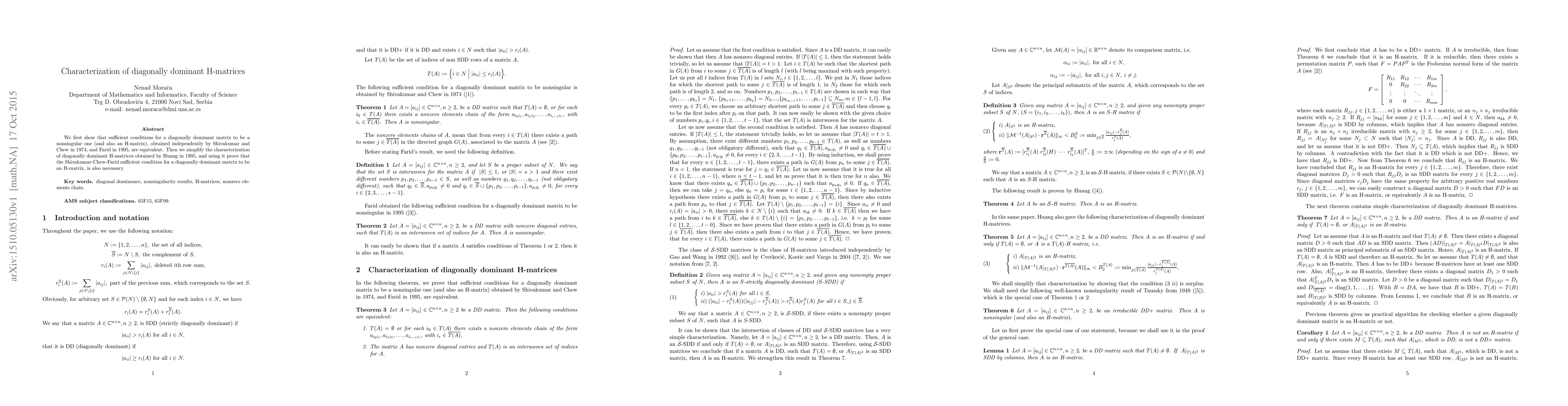 This paper demonstrates the equivalence of sufficient conditions for diagonally dominant matrices to be nonsingular H-matrices, originally proposed by Shivakumar and Chew in 1974 and Farid in 1995. It further simplifies the characterization of diagonally dominant H-matrices and proves the necessity of these conditions.