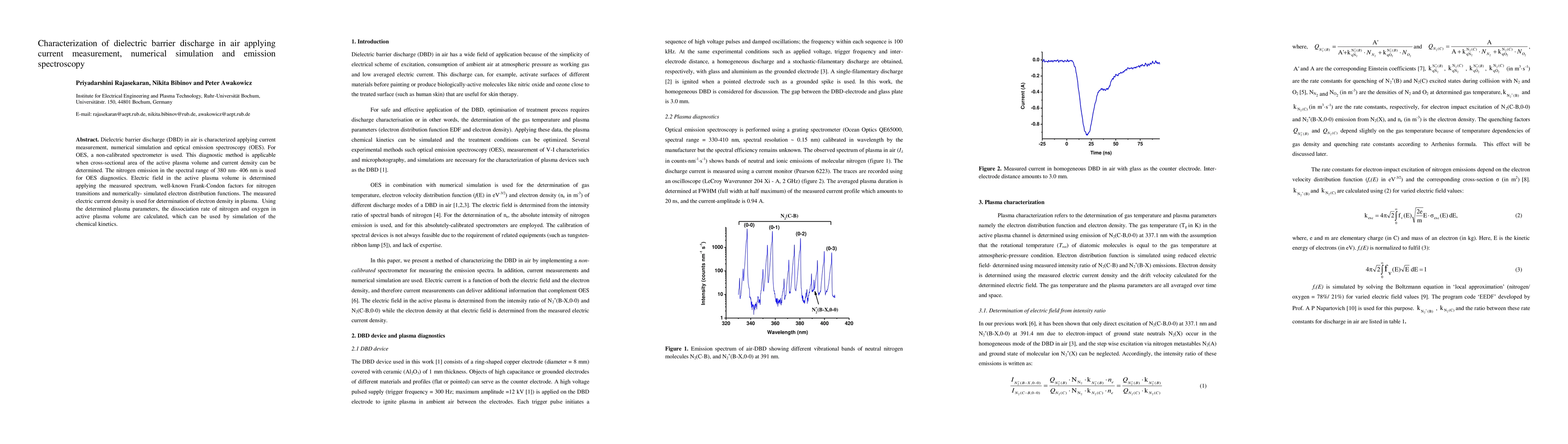 Dielectric barrier discharge (DBD) in air is characterized applying current measurement, numerical simulation and optical emission spectroscopy (OES). For OES, a non-calibrated spectrometer is used. This diagnostic method is applicable when cross-sectional area of the active plasma volume and current density can be determined. The nitrogen emission in the spectral range of 380 nm- 406 nm is used for OES diagnostics. Electric field in the active plasma volume is determined applying the measured spectrum, well-known Frank-Condon factors for nitrogen transitions and numerically- simulated electron distribution functions. The measured electric current density is used for determination of electron density in plasma. Using the determined plasma parameters, the dissociation rate of nitrogen and oxygen in active plasma volume are calculated, which can be used by simulation of the chemical kinetics.