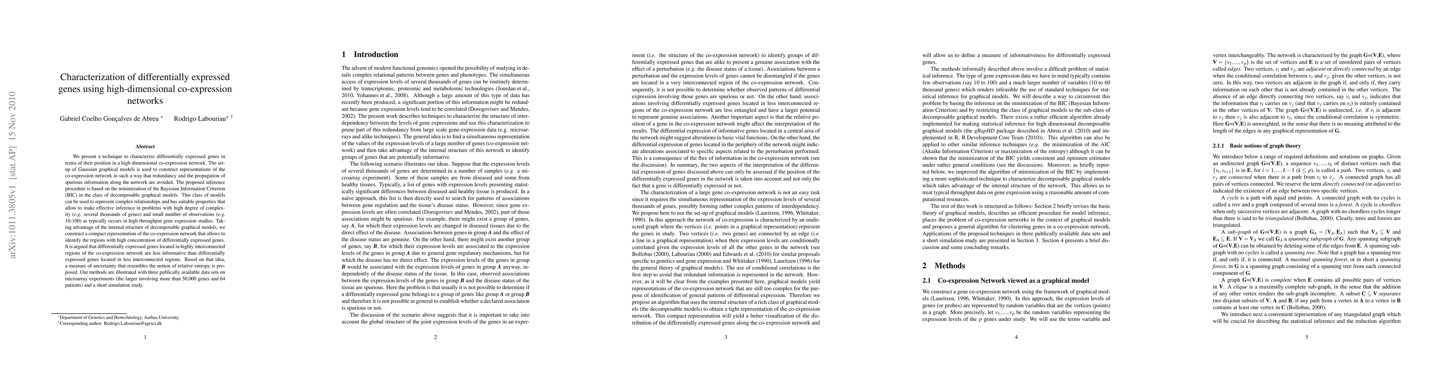 This paper introduces a method to characterize differentially expressed genes through high-dimensional co-expression networks using Gaussian graphical models, minimizing the Bayesian Information Criterion to avoid redundancy and spurious information. It proposes a measure of uncertainty based on gene connectivity to identify informative differentially expressed genes.