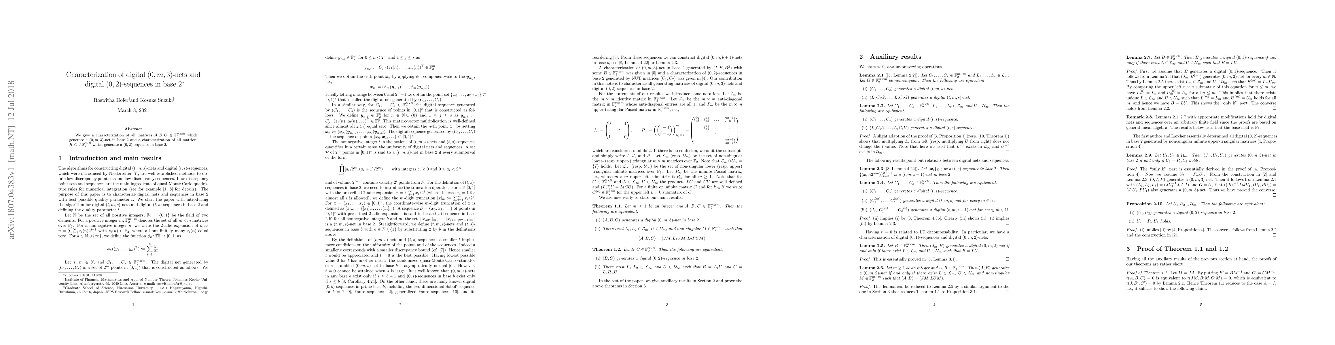 We give a characterization of all matrices $A,B,C \in \mathbb{F}_{2}^{m \times m}$ which generate a $(0,m,3)$-net in base $2$ and a characterization of all matrices $B,C\in\mathbb{F}_{2}^{\mathbb{N}\times\mathbb{N}}$ which generate a $(0,2)$-sequence in base $2$.
