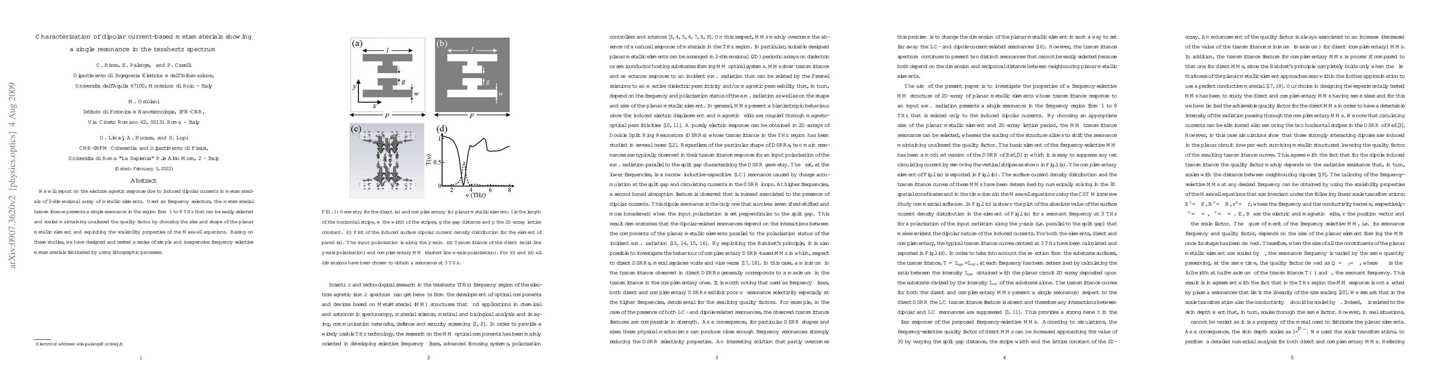 We will report on the electromagnetic response due to induced dipolar currents in metamaterials of 2-dimensional array of metallic elements. Used as frequency selectors, the metamaterial transmittance presents a single resonance in the region from 1 to 8 THz that can be easily selected and scaled maintaining unaltered the quality factor by choosing the size and shape of the planar metallic element and exploiting the scalability properties of the Maxwell equations. Basing on these studies, we have designed and tested a series of simple and inexpensive frequency selective metamaterials fabricated by using lithographic processes.