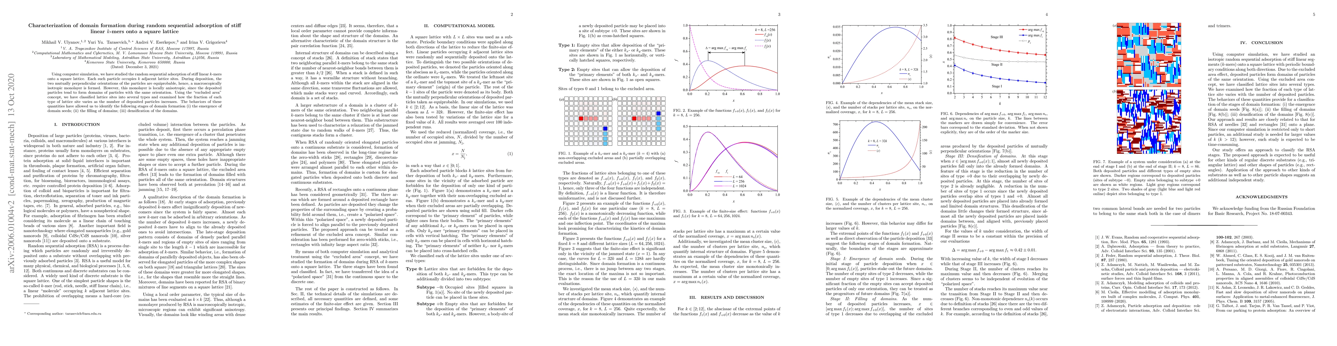 Using computer simulation, we have studied the random sequential adsorption of stiff linear $k$-mers onto a square lattice. Each such particle occupies $k$ adjacent lattice sites. During deposition, the two mutually perpendicular orientations of the particles are equiprobable, hence, a macroscopically isotropic monolayer is formed. However, this monolayer is locally anisotropic, since the deposited particles tend to form domains of particles with the same orientation. Using the "excluded area" concept, we have classified lattice sites into several types and examined how the fraction of each type of lattice site varies as the number of deposited particles increases. The behaviors of these quantities have allowed us to identify the following stages of domain formation (i) the emergence of domain seeds; (ii) the filling of domains; (iii) densification of the domains.