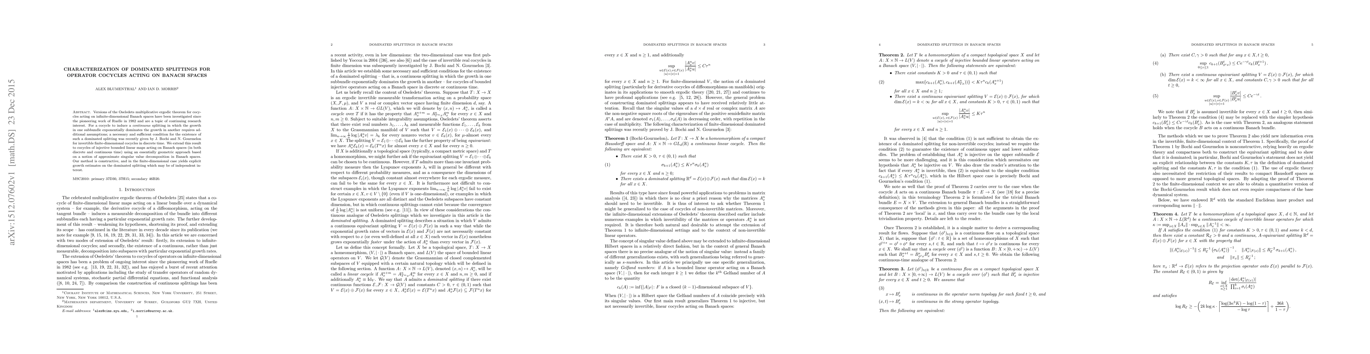 This paper extends the characterization of dominated splittings for operator cocycles on Banach spaces, generalizing results from finite-dimensional settings. It introduces a geometric approach using approximate singular value decomposition to establish necessary and sufficient conditions for the existence of such splittings.