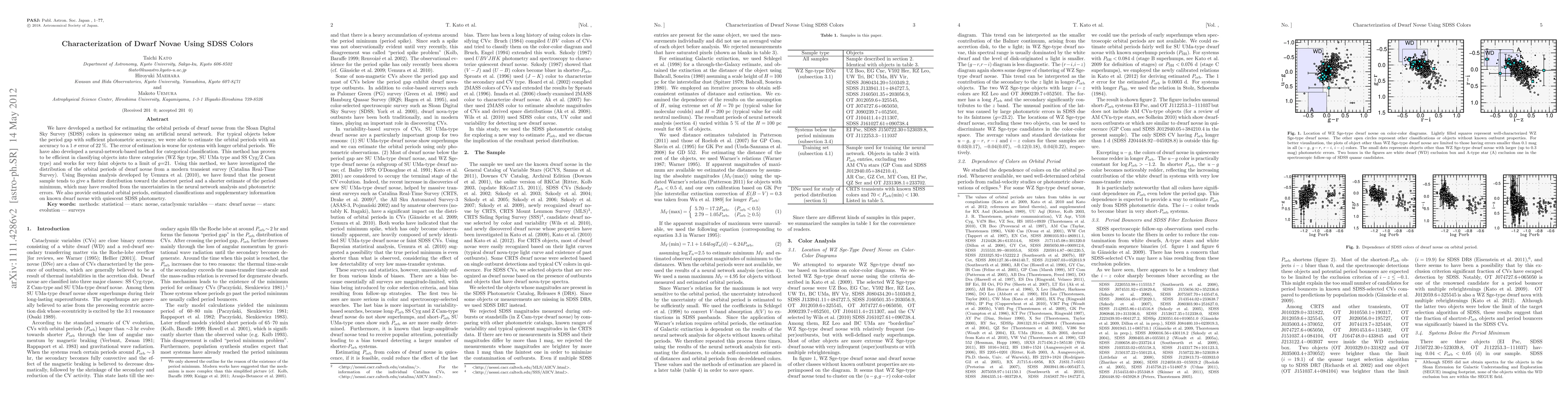 This paper develops an artificial neural network to estimate the orbital periods of dwarf novae from SDSS colors during quiescence, achieving an accuracy of 22% error. It also introduces a neural-network-based method for classifying dwarf novae into three types, which works for faint objects down to g=21.