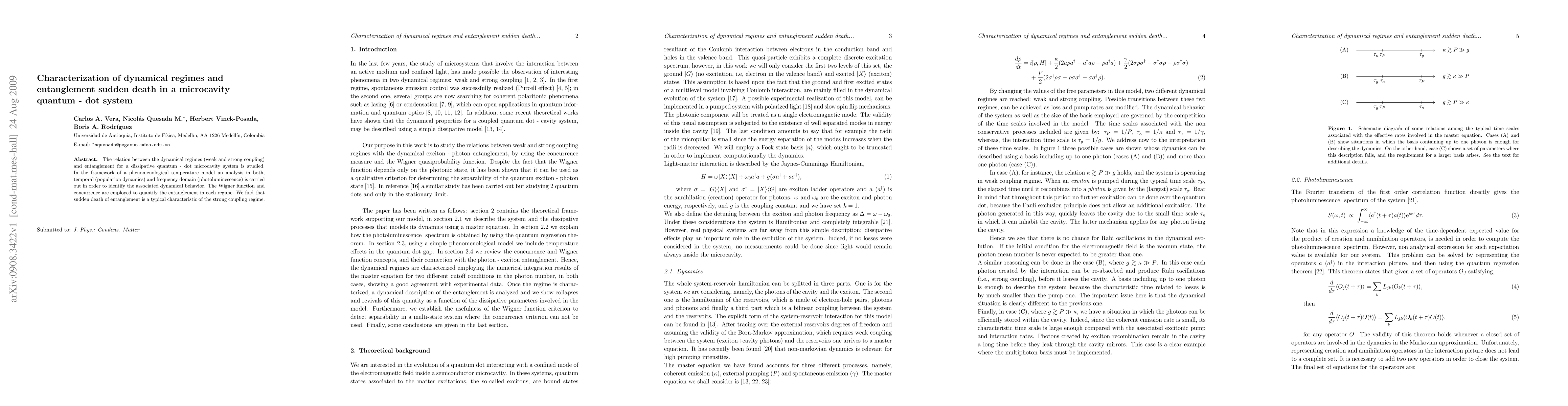 This paper investigates the relationship between dynamical regimes and entanglement in a microcavity quantum-dot system, employing a temperature model to analyze population dynamics and photoluminescence. It finds that entanglement sudden death is prevalent in the strong coupling regime, characterized by the use of Wigner function and concurrence for entanglement quantification.
