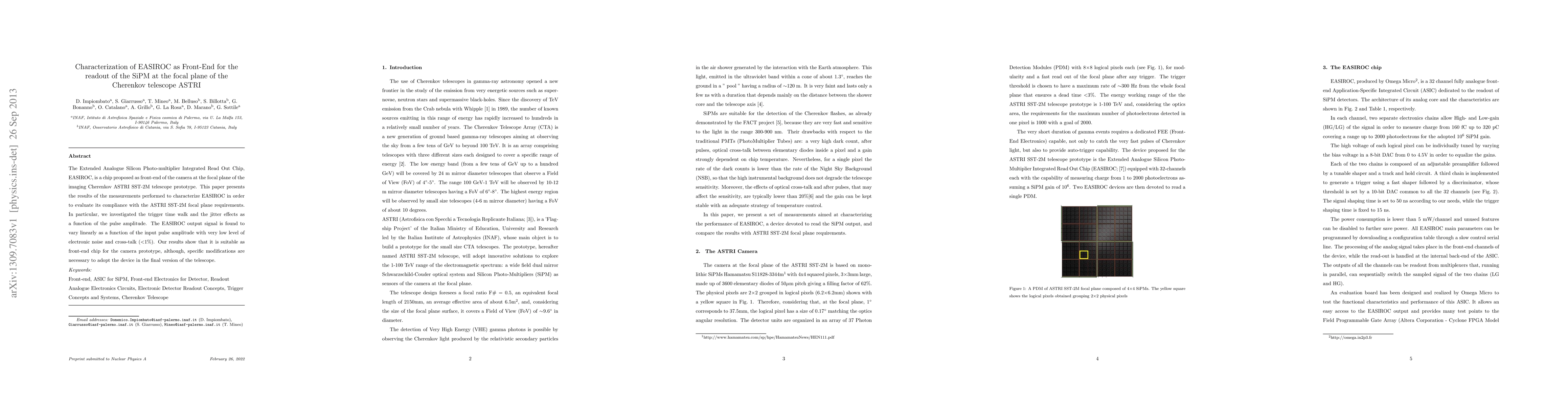 This paper characterizes EASIROC as a front-end readout chip for the SiPM in the ASTRI SST-2M telescope's focal plane, finding it compliant with requirements but needing specific modifications for final use. Measurements show low noise and linear output signal with respect to input pulse amplitude.