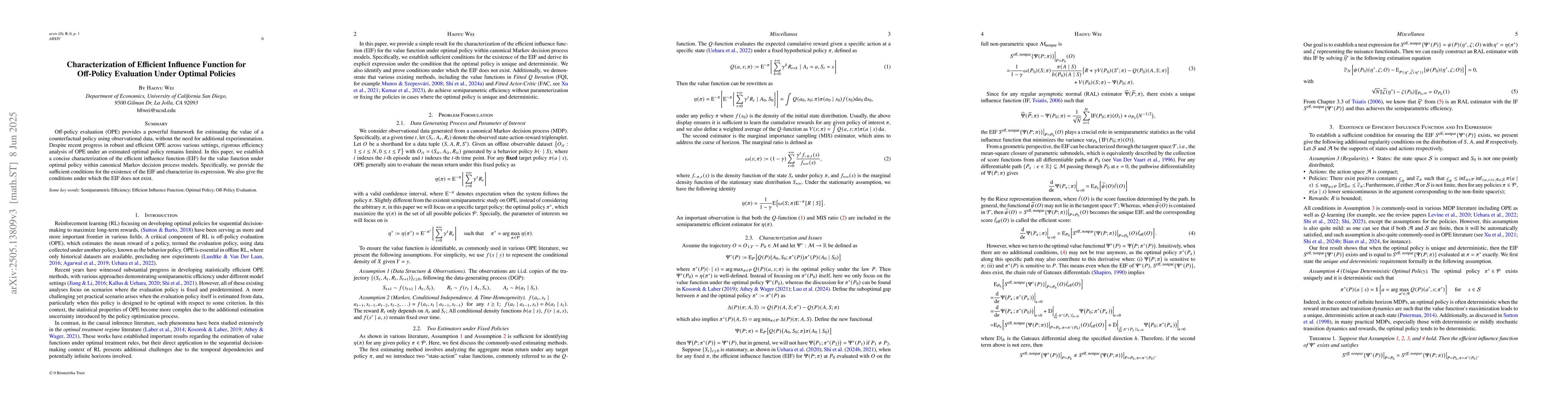 The paper presents a characterization of the EIF for off-policy evaluation under optimal policies, providing both existence conditions and expression.