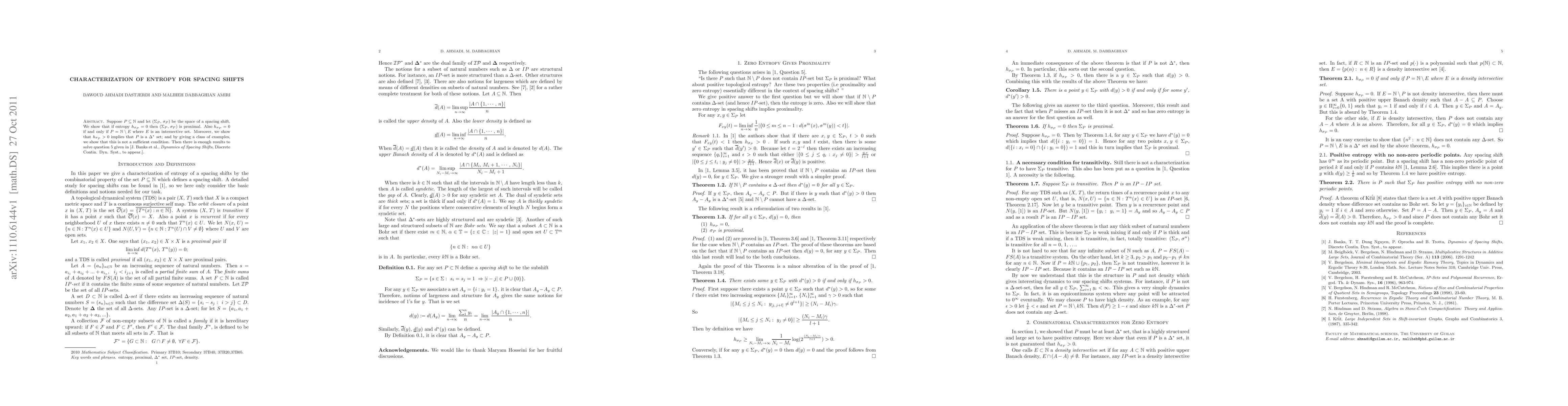 A study on entropy in spacing shifts reveals that a space with zero entropy is proximal, and its inverse set is intersective. Non-zero entropy implies the presence of a specific type of subset.